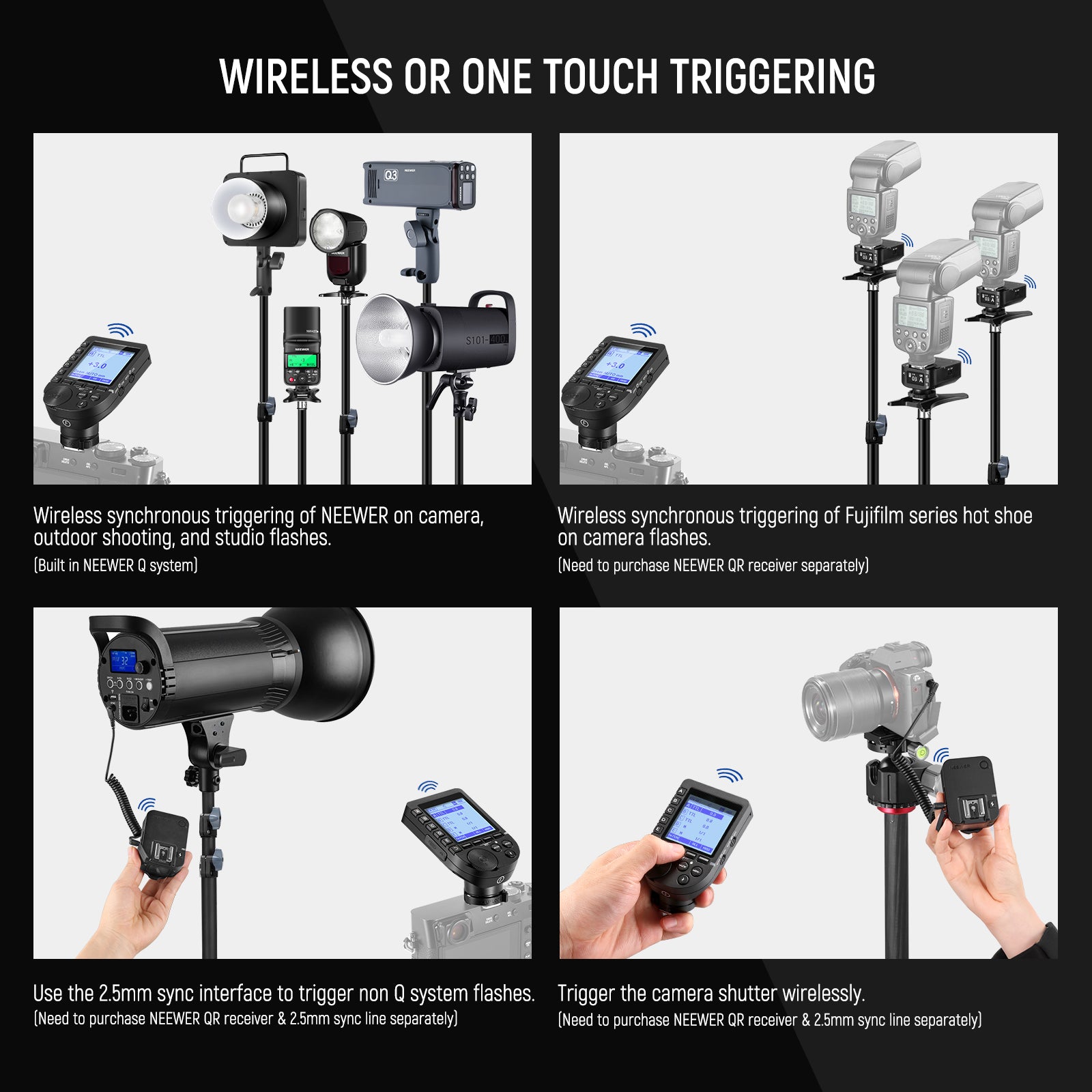 NEEWER flash triggers are versatile and professional, offering powerful features to enhance your photography. These light triggers support a wide range of functions, including TTL, multi-flash, manual flash, flash exposure compensation (FEC), magnification, group modeling lamp control, group zooming, and more. Our collection includes flash triggers compatible with Canon, Sony, Nikon, and other major brands. Choose a reliable flash trigger to take your photography to the next level.