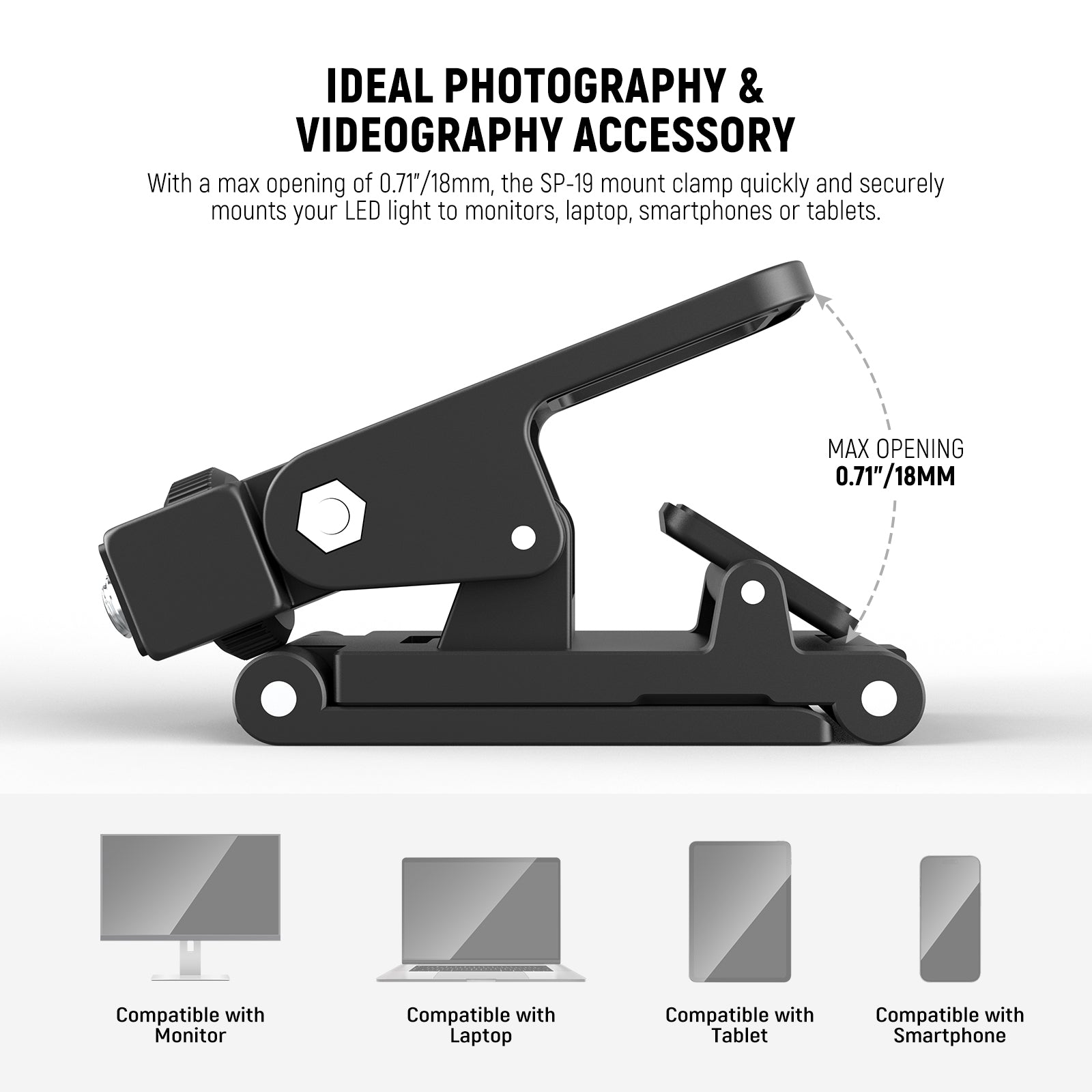 - Ideal Photography & Videography Accessory- With a max opening of 0.71"/18mm, the SP-19 mount clamp quickly and securely mounts your LED light to monitors, computer cameras, displays, laptop, smartphones for TikTok YouTube video recording filming, video conferencing, zoom calls, live streaming, selfies, vlogs, and more, or tablets, ideal as essential accessories/must have lighting gear for professional photographers & videographers, content creators, streamers, and social media influencers