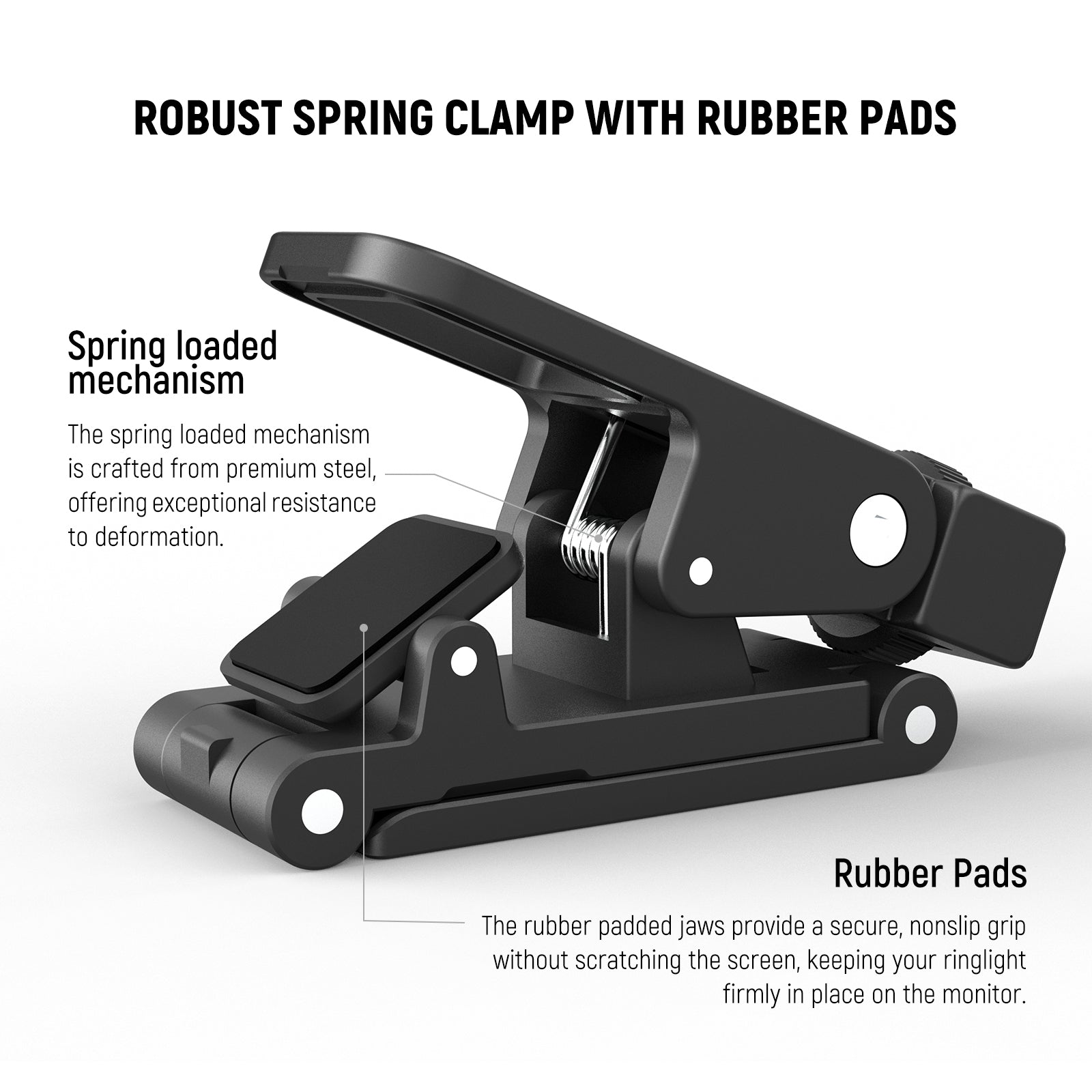 - Robust Spring Clamp with Rubber Pads- The spring loaded mechanism is crafted from premium steel, offering exceptional resistance to deformation. The rubber padded jaws provide a secure, nonslip grip without scratching the screen, keeping your ringlight firmly in place on the monitor. Also with a built in hook for convenient hanging on the monitor