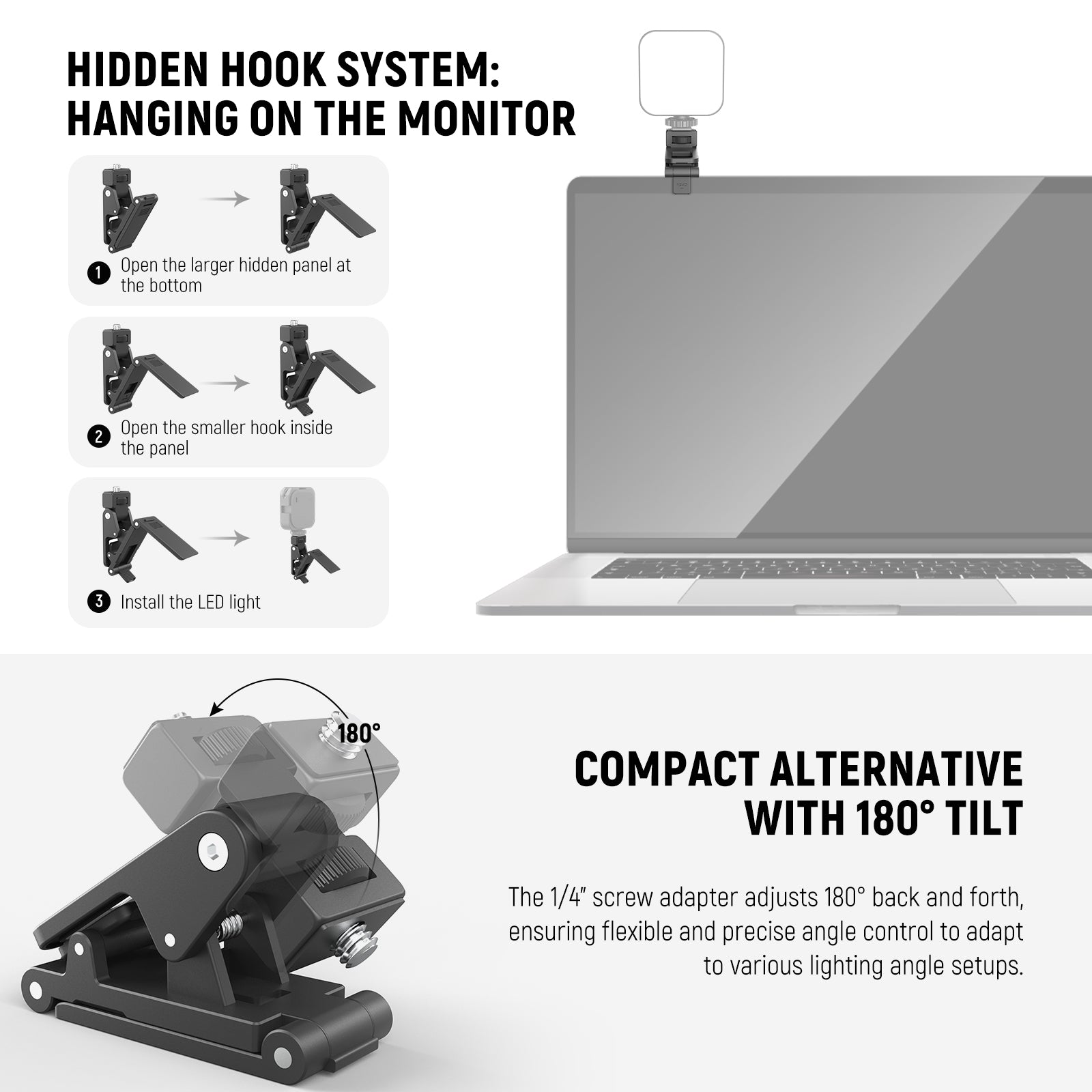 - Compact Alternative with 180° Tilt- The 1/4" screw adapter adjusts 180° back and forth, ensuring flexible and precise angle control to adapt to various lighting angle setups. Compared with tabletop tripods, the clamp mount saves desktop space and offers quick setup