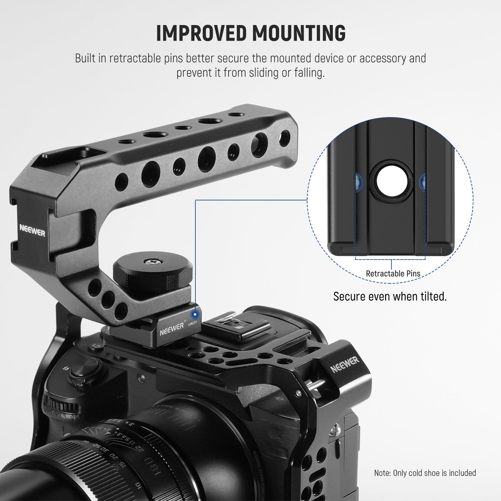 - Standard Cold Shoe Mount- Includes 2x cold shoe mount adapter, 2x 1/4" screws, and 1x L-shaped hex key to expand your photography rig. Simply tighten any of the 1/4" screws into the top threaded hole, and this cold shoe mount connects to speedlite flashes, wireless microphones, field monitors and other hot shoe accessories, and can be attached to cages or handles with a 1/4" thread