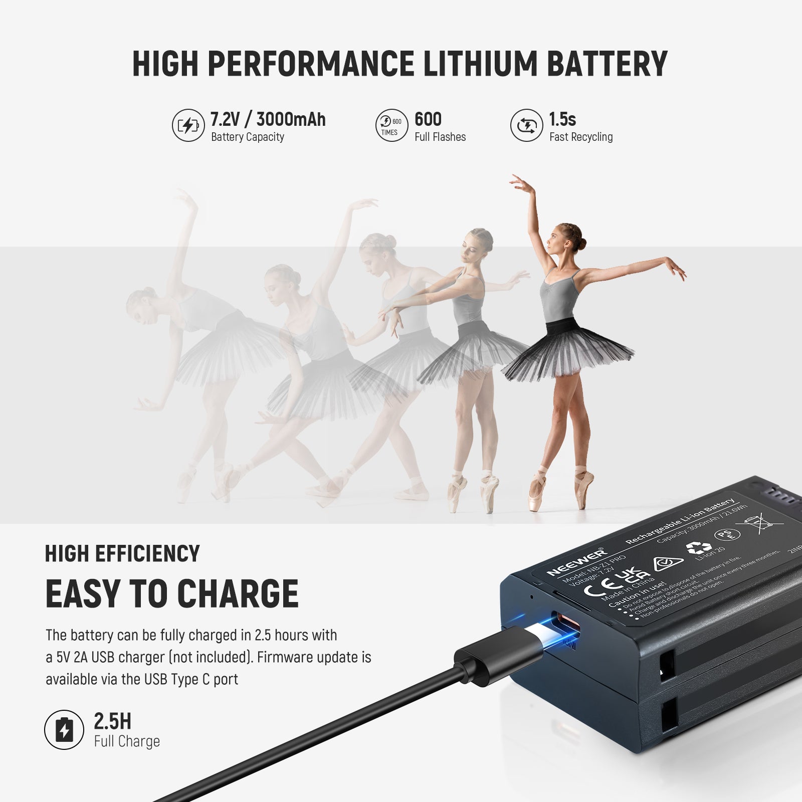 - High Capacity & Fast Recycling- The 7.2V/3000mAh lithium battery provides 600 full power flashes, 1.5s fast recycling time, and a 1/180-1/20000s flash duration. The battery can be fully charged in 2.5 hours with a 5V 2A USB charger (not included).Firmware update is available via the USB Type C port
