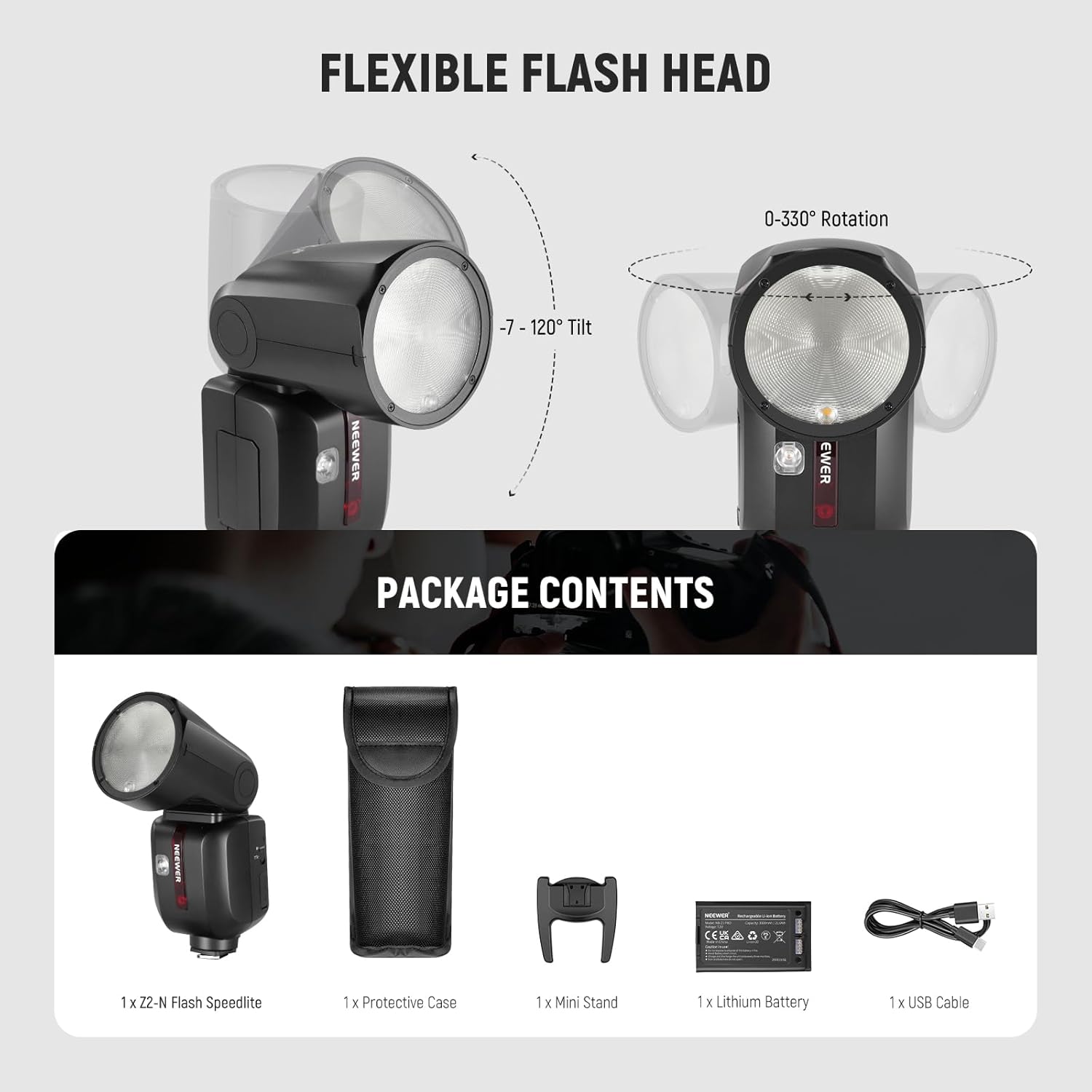 - Great Performance & Modeling Lamps- 76Ws max output, 5600K stable color temperature, and a circular Fresnel flash head ensure even, soft, and natural light effects. The flash head with 0-330° swivel and -7-120° tilt bounces flashes freely. Two upgraded 2W 3300K LED modeling lamps (one below the flash head) offer 10 brightness levels (01-10)