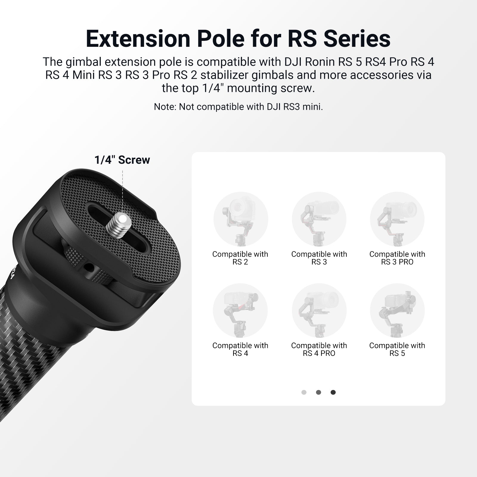 - Extension Pole for RS Series- The gimbal extension pole is compatible with DJI Ronin RS 5 RS4 Pro RS 4 RS 4 Mini RS 3 RS 3 Pro RS 2 stabilizer gimbals and more accessories via the top 1/4" mounting screw. Note: Not compatible with DJI RS3 mini