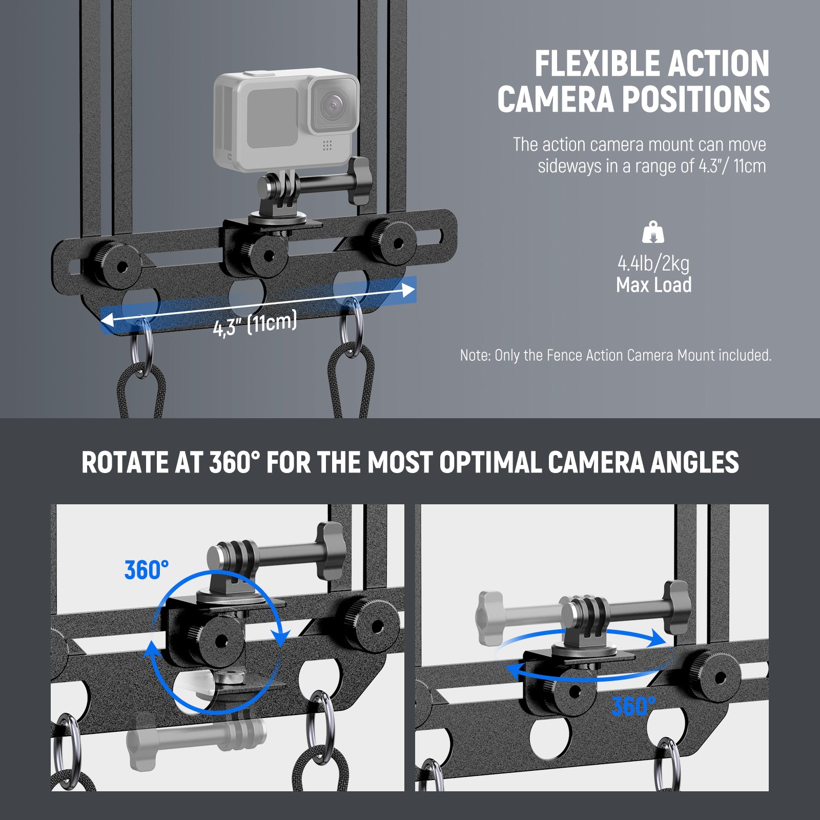 - Flexible Fence Mounting- The action camera mount can move sideways in a range of 4.3" (11cm) and rotate at 360° for the most optimal shooting angles. Or use the included phone holder for left to right, up and down adjustment, ensuring that the fence does not obstruct the screen during video recording