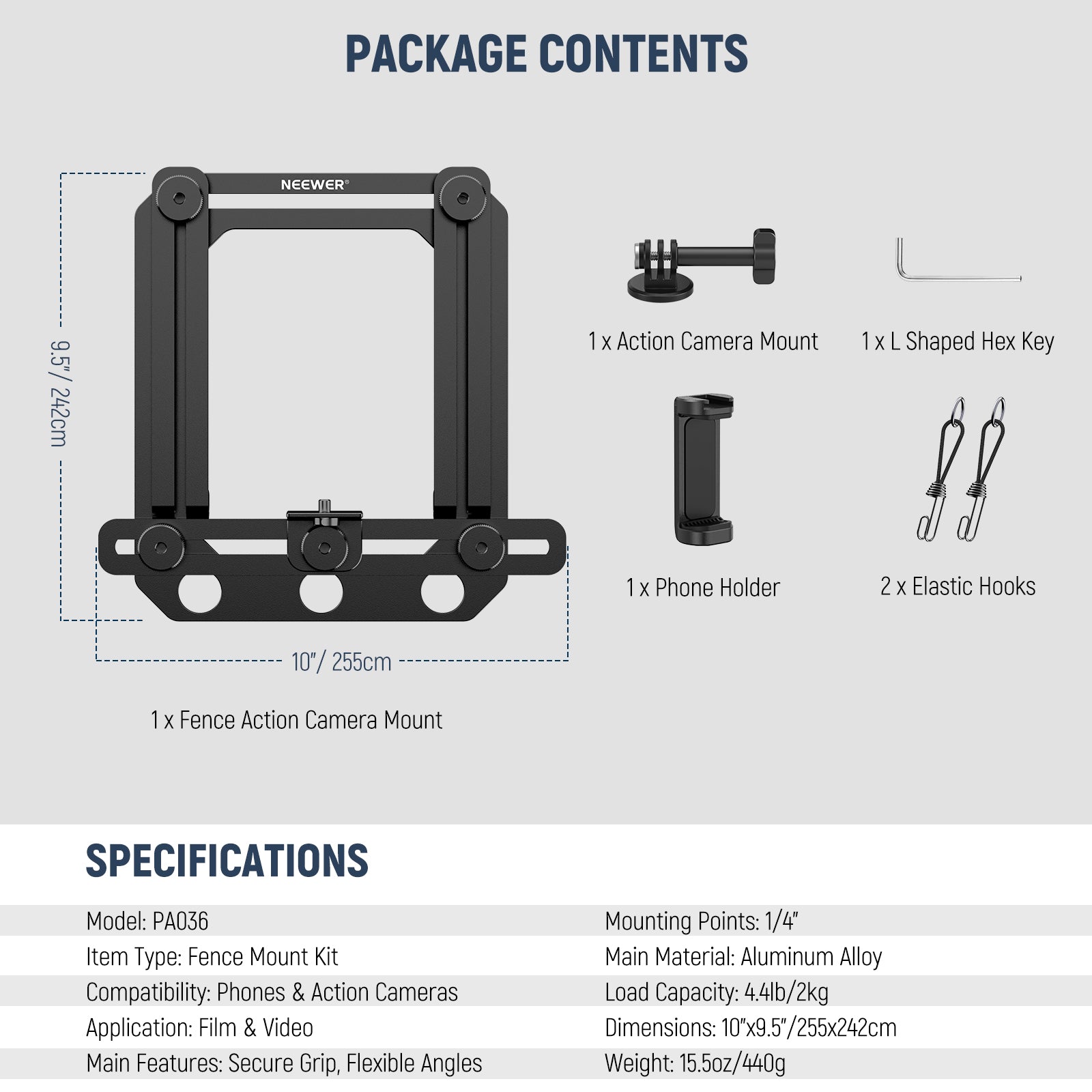 NEEWER PA036 Camera Fence Mount with Phone Holder & Action Camera Adapter
