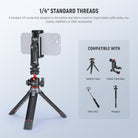 • Two 1/4" Standard Threads- A standard 1/4" screw hole designed on the bottom and side to mount on tripod stands, selfie sticks, monopods, stabilizers, or other accessories. This phone holder for tripod provides stable support for your phone to make perfect videography, vlog, live streaming, or other creative content