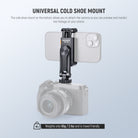 • Universal Cold Shoe Mount- The bottom of a cold shoe mount allows you to attach a camera, so you can preview and monitor real time shooting footage on your phone with this camera phone mount. Or you can attach an LED fill light, video light, microphone, or other equipment to improve your video quality