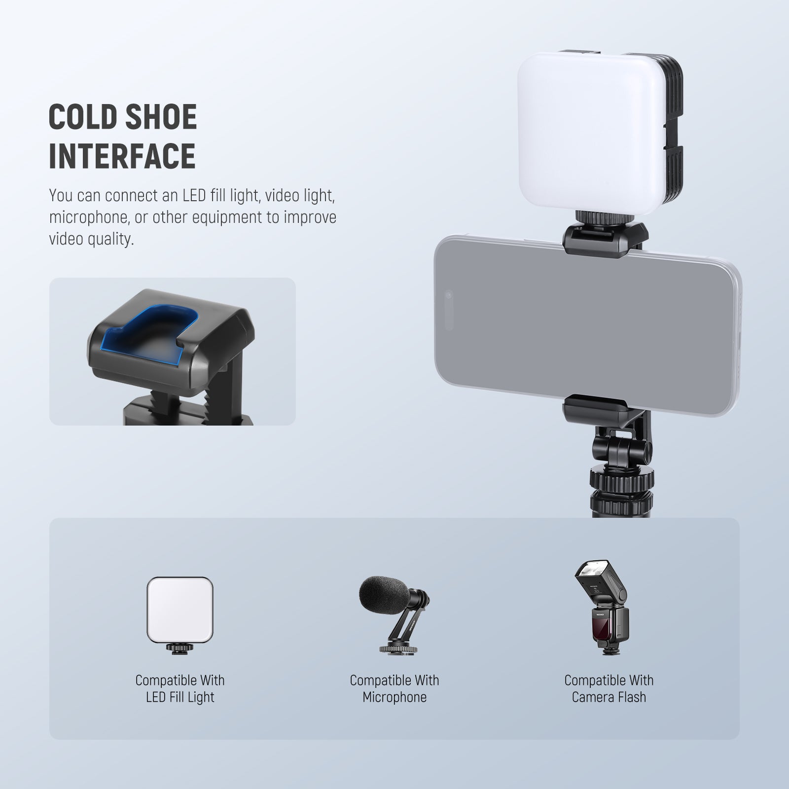 • Stable & Secure Phone Clamp- Our cold shoe phone mount features a silicone pad inside the clamp to enhance slip resistance and protect your phone from scratches. It firmly holds your phone on your tripod, freeing your hands and allowing you to focus on your live stream, selfie, or photography