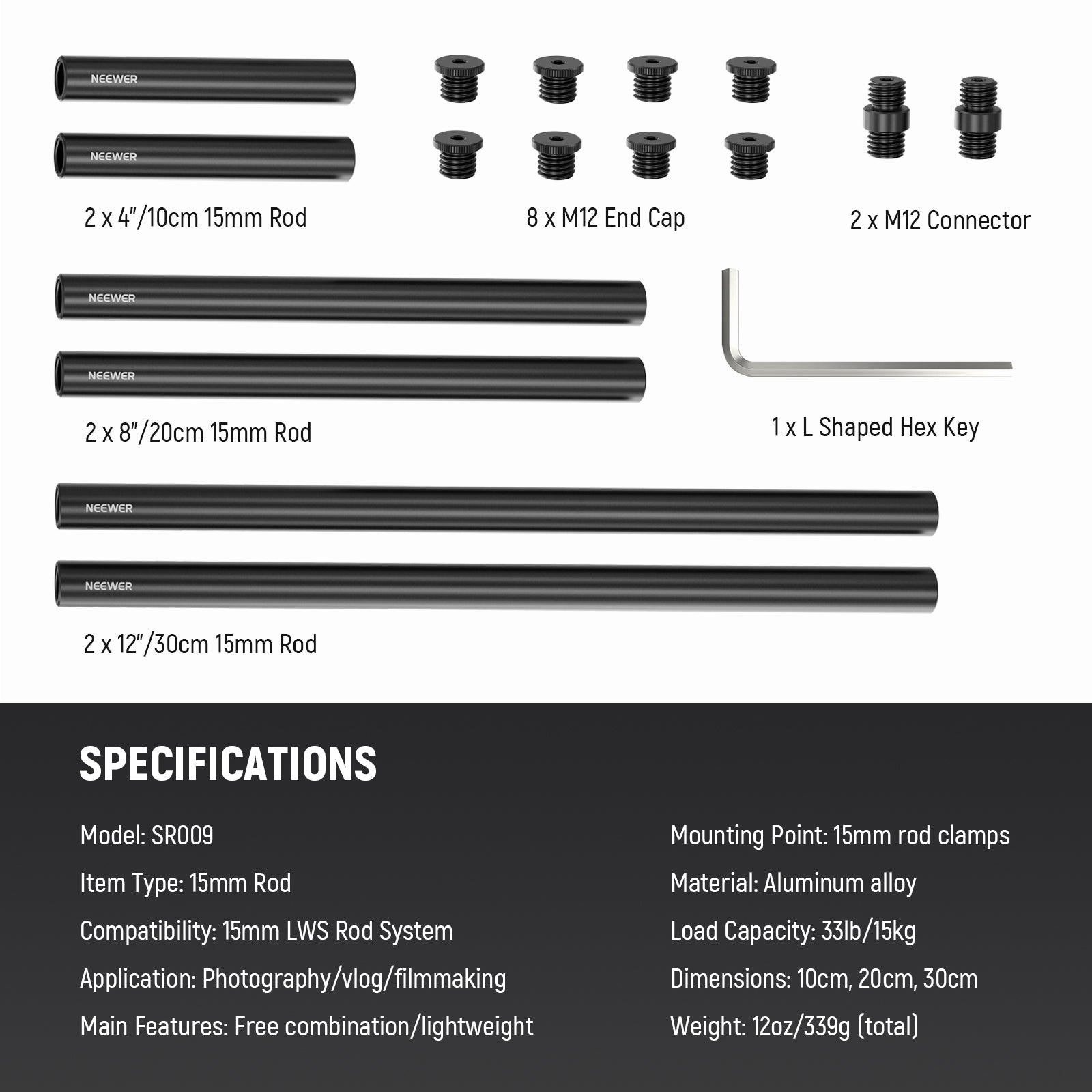 - Extendable Length- Combine two 15mm rods with the included M12X1.5 threaded connector for flexible accessory positioning. Note: The connector is only compatible with NEEWER aluminum alloy 15mm rods and 15mm LWS shoulder rigs (such as SR004 & SR007)