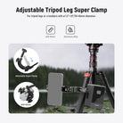 - Adjustable Tripod Leg Super Clamp- This multifunctional super clamp holder offers multiple mounting points for accessory expansion. It attaches to a tripod with ø 1.2"-1.8"/30-45mm tripod legs or rods and crossbars of the same diameters. Engineered with robust aluminum alloy, it can support devices of up to 11lb/5kg
