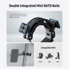 - Double Integrated Mini NATO Rails- Two mini NATO rails accept any accessory with a NATO clamp for efficient mounting, including NEEWER MA005 Camera Monitor Mount, UA025 Cable Anchor, GA010 Phone Tripod Mount, and others