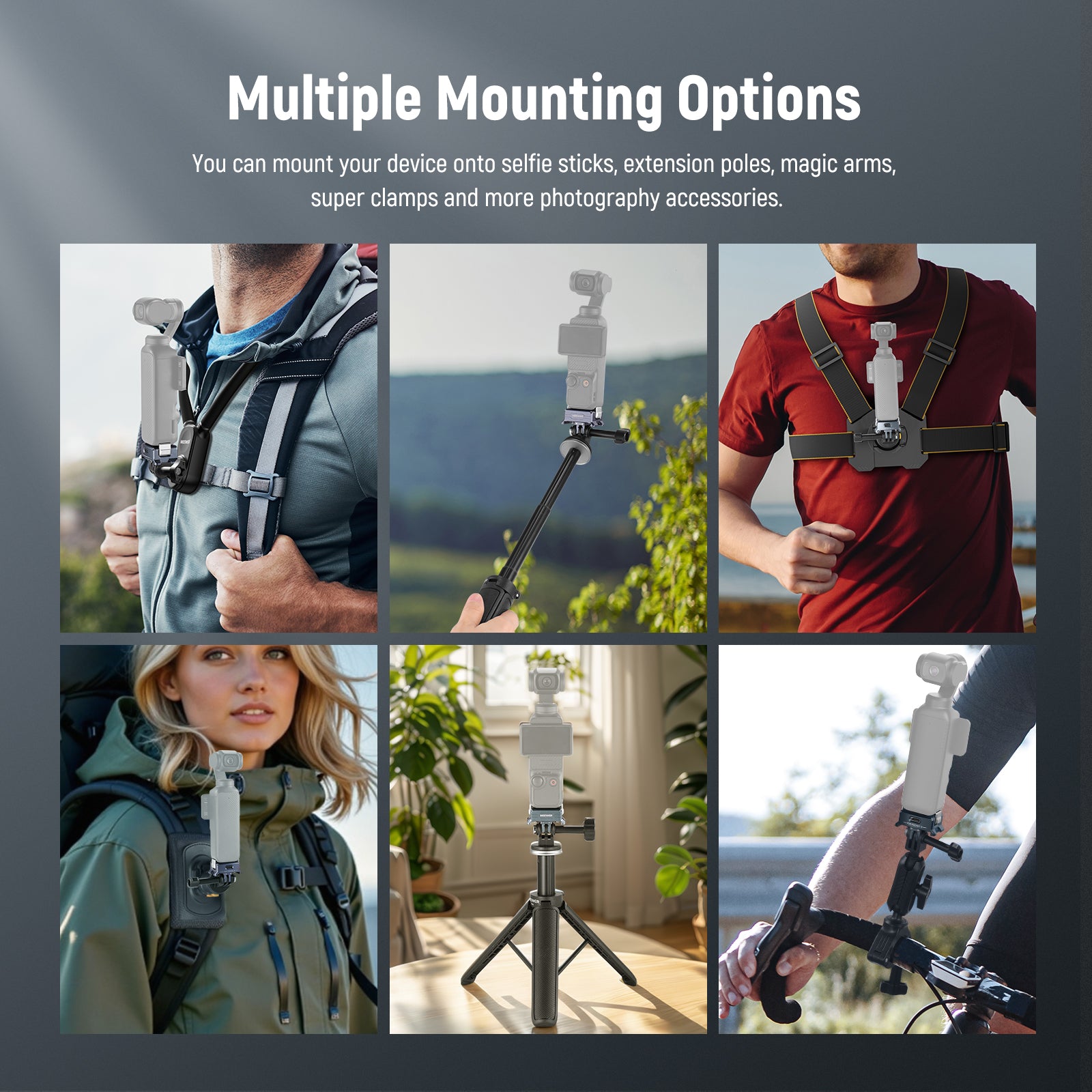 NEEWER offers action camera rigs designed to enhance your photography and videography. Our collection includes action camera mounts, protectors, straps, and more. These rigs allow you to capture immersive hands-free POV shots, making them ideal for activities such as skiing, snowboarding, mountain biking, cycling, kayaking, rafting, surfing, climbing, and more.