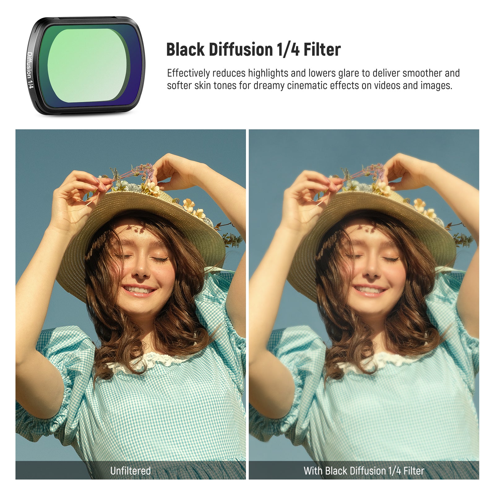 - Dreamy Cinematic Vibe & Stunning Night Footages- The black diffusion 1/4 filter with dreamy cinematic effect reduces highlights and lowers the glare for a hazier and softer look, ideal for portraits, videos, and vlogs. The light pollution reduction filter reduces the yellow/green color caused by city lights, captures details of your filming subject, keeps proper contrasts, and avoids overexposure