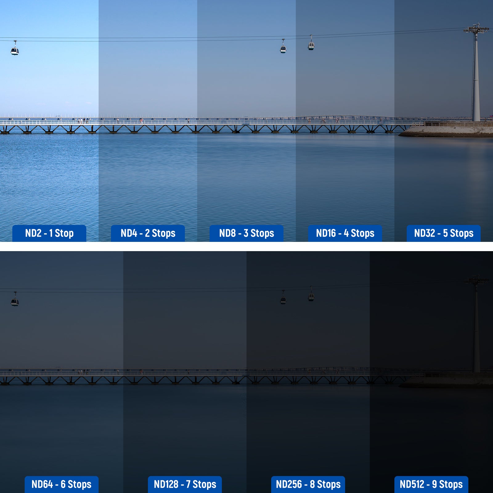 - Flexible Balanced Exposure Control- The adjustable ND2-32 filter with 1 to 5 stops of light reduction is suitable for moderate lighting conditions, enabling slower shutter speeds and wider apertures. The adjustable ND64-512 filter with 6 to 9 stops of light reduction is more appropriate for bright lighting situations. It allows for longer shutter speeds, even in intense light, offering creative effects such as smooth waterfalls or blurred motion