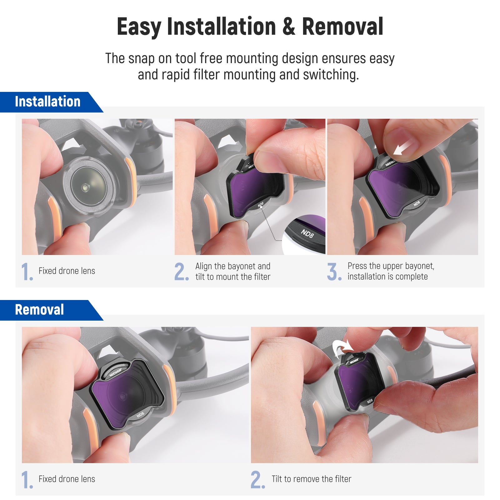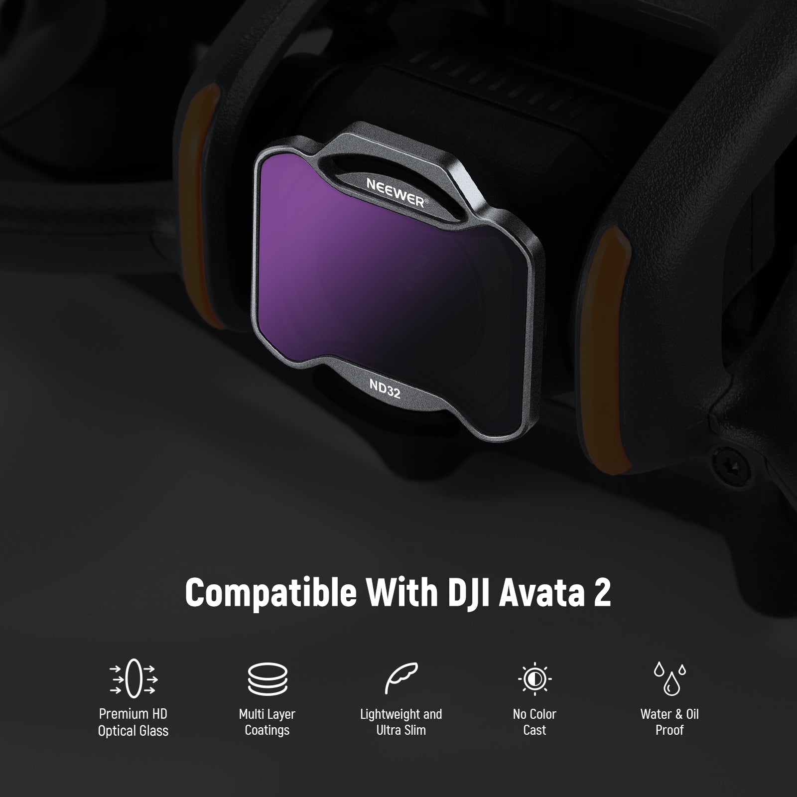 - Fully Compatible with Avata 2- NEEWER ND Filter Set Compatible with DJI Avata 2 includes ND8, ND16, ND32, and ND64, enabling you to select the perfect neutral density filter to precisely control the aperture and shutter speed. Mount NEEWER ND filter on your drone’s lens, improve exposure control in varying weather conditions to deliver magic and thrilling drone shots