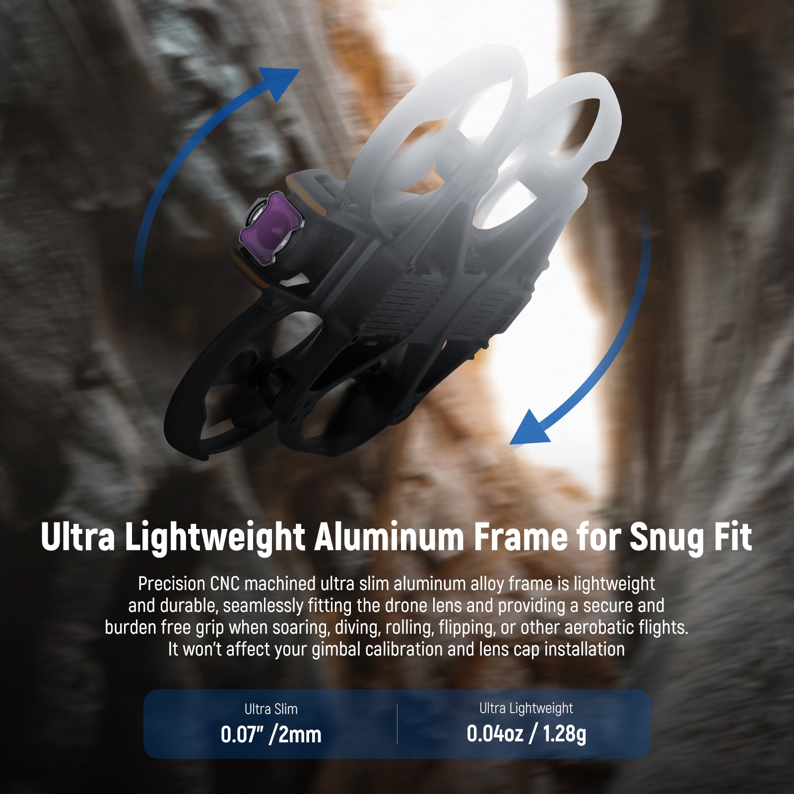 - Ultra Lightweight Aluminum Frame for Snug Fit- Precision CNC machined ultra slim aluminum alloy frame is lightweight and durable, seamlessly fitting the drone lens and providing a secure and burden free grip when soaring, diving, rolling, flipping, or other aerobatic flights. It won’t affect your gimbal calibration and lens cap installation