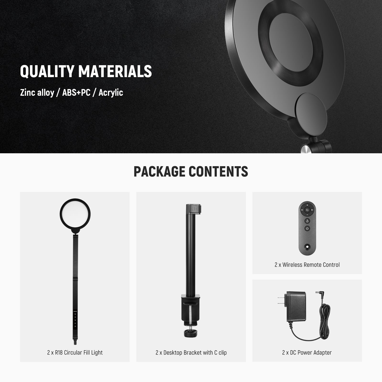 • 18W Full Screen Streaming Key Ring Light- The R18 7" full screen LED fill light is equipped with 84 built in LEDs, delivering illumination of up to 1380lux/0.5m, offering widespread light coverage that surpasses traditional ring lights. The premium panel with edge lit technology ensures soft, uniform lighting without shadows, brightening your skin and concealing facial blemishes to help you look your best on camera
