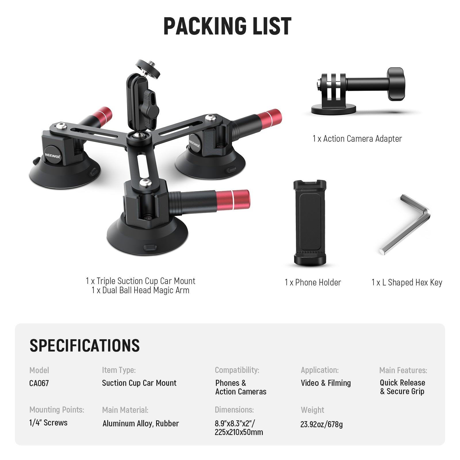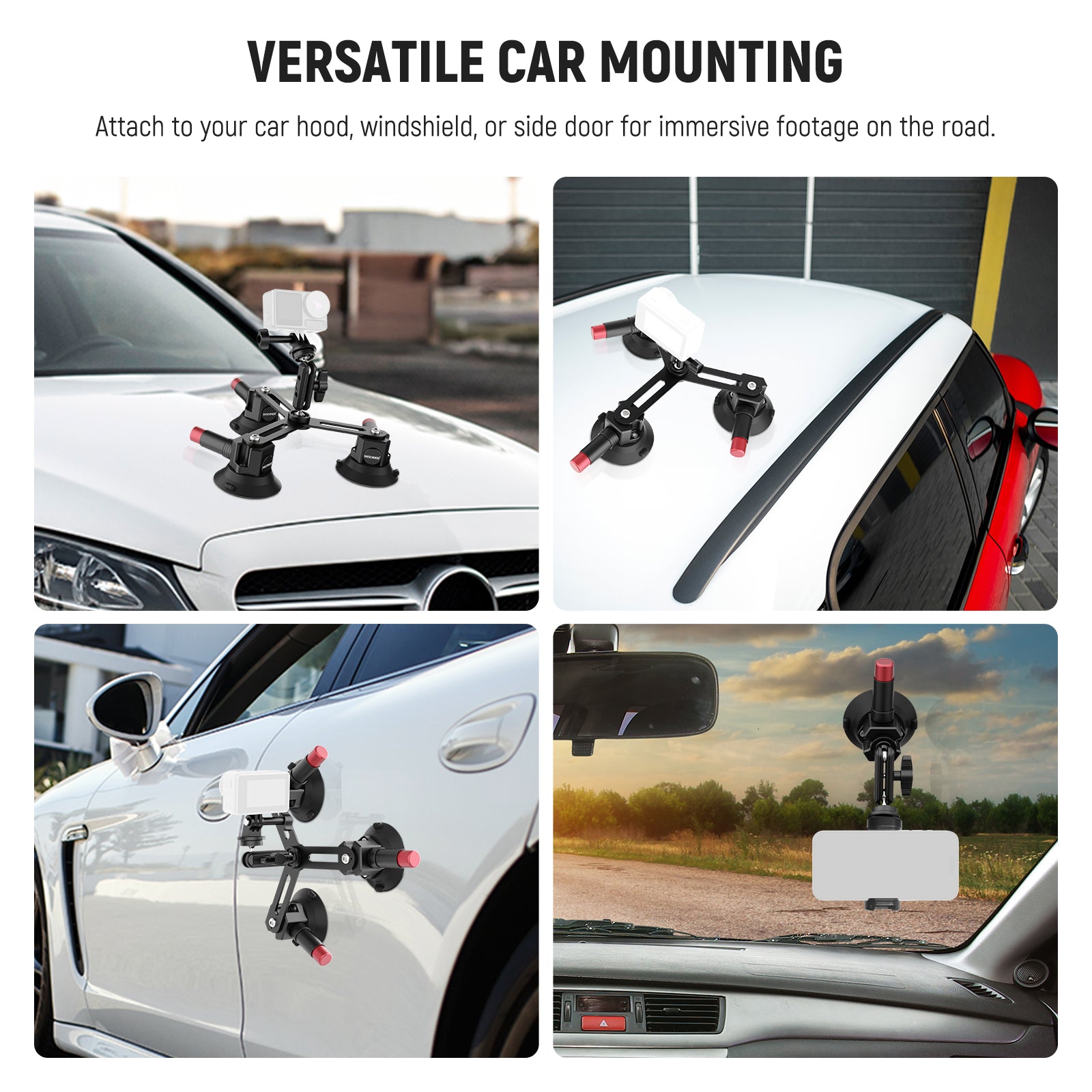 - Triple Suction Cup Car Mount Kit- Capture unique driving angles from your engine hood, windshield, or car side for immersive footage on the road. This triple suction cup camera mount securely attaches your phone or action camera with three powerful suction cups, and position it using the ball head magic arm for various shooting perspectives. Note to use at speeds below 80 km/h to prevent accidental drops