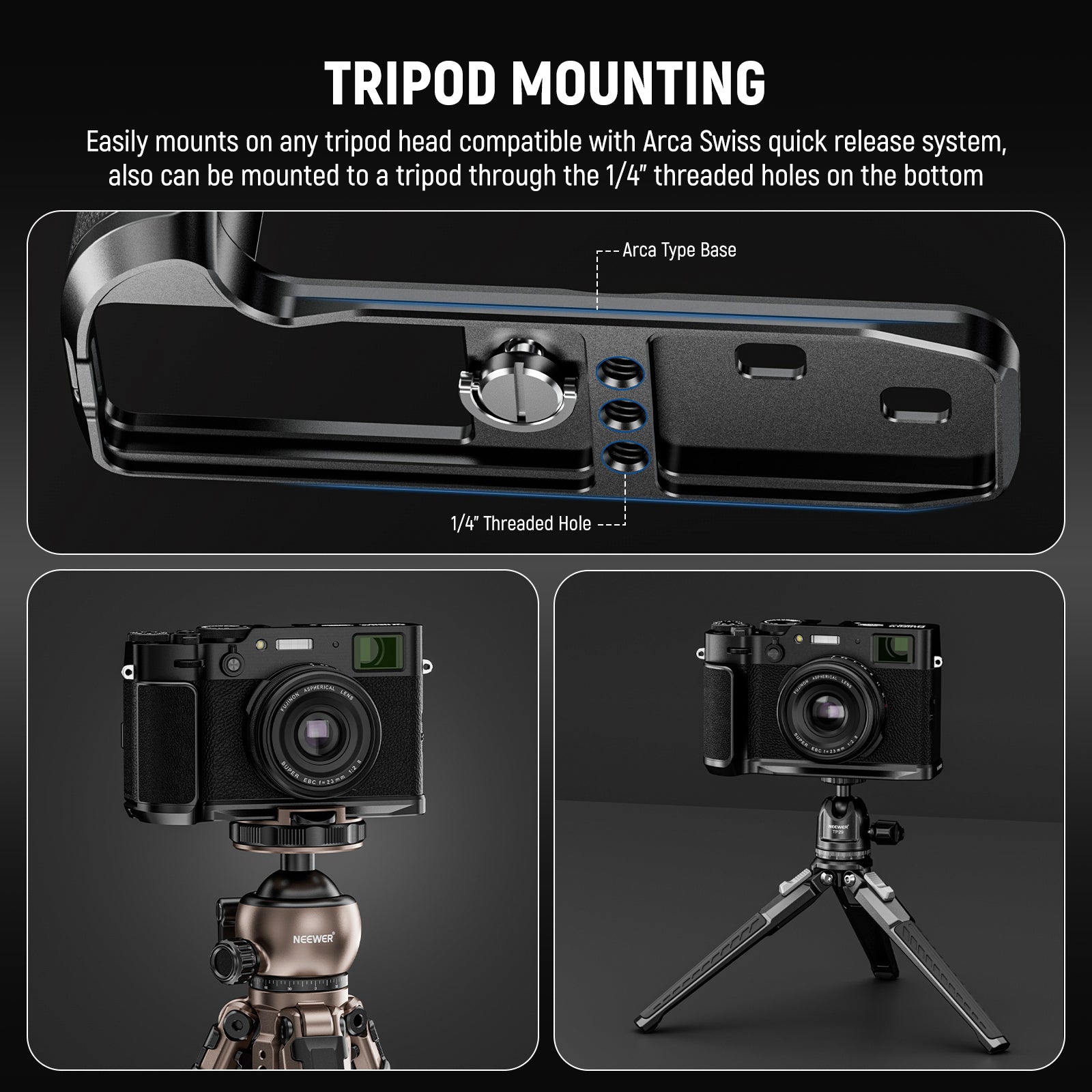 - For X100VI & X100V Camera- Compatible with Fujifilm X100VI and X100V, this baseplate with a L shape handgrip simply attaches to your camera with a 1/4" screw and enhances handheld photography, vlogging, and filmmaking