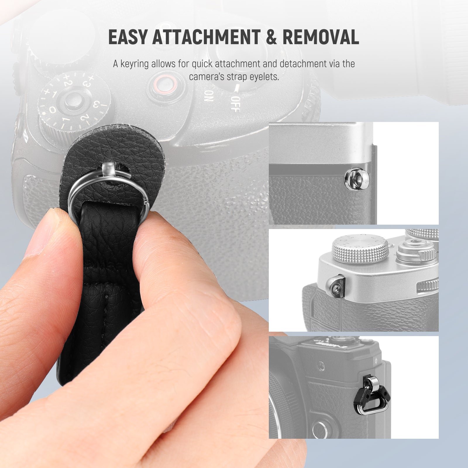 - Easy Attachment & Removal- A keyring allows for quick attachment and detachment via the camera's strap eyelets