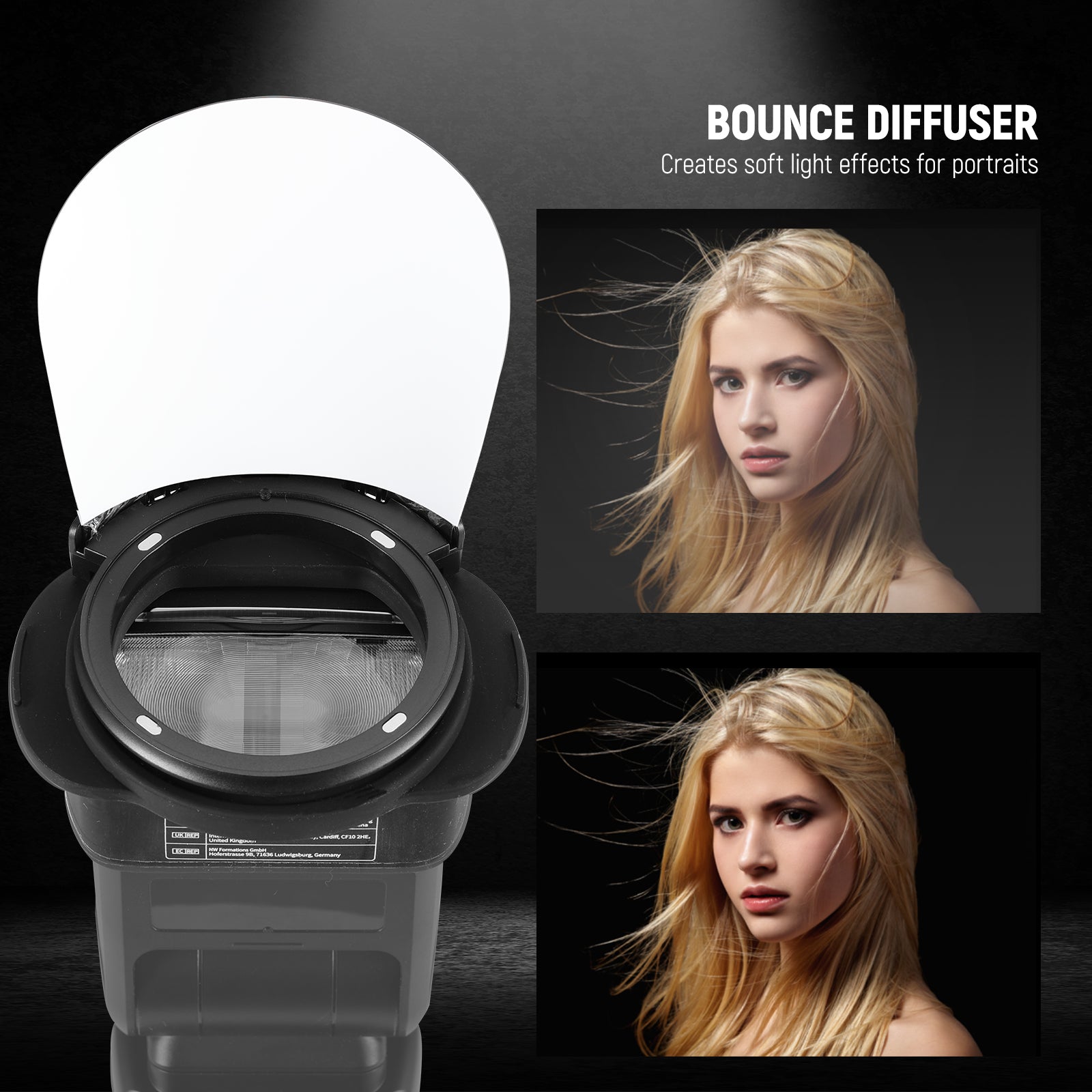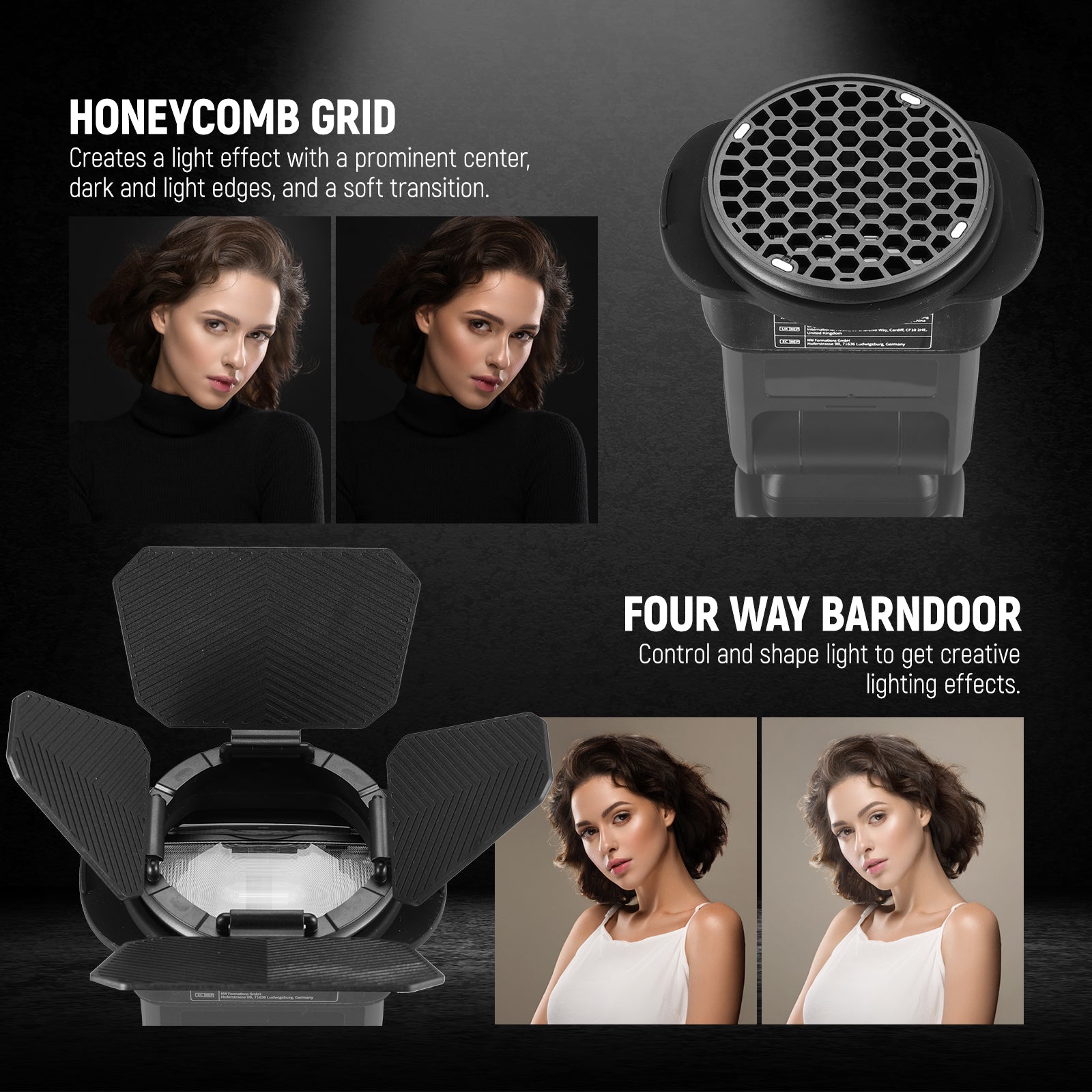 - Effortless Creative Flash Effects- The conical snoot narrows the beam to accent subjects, the honeycomb grid enhances contrast to highlight contours, the dome diffuser and diffusion panel scatter and soften the light, the bounce diffuser fills shadows, the four way barndoor shapes light spread, and color gels in three colors add various hues