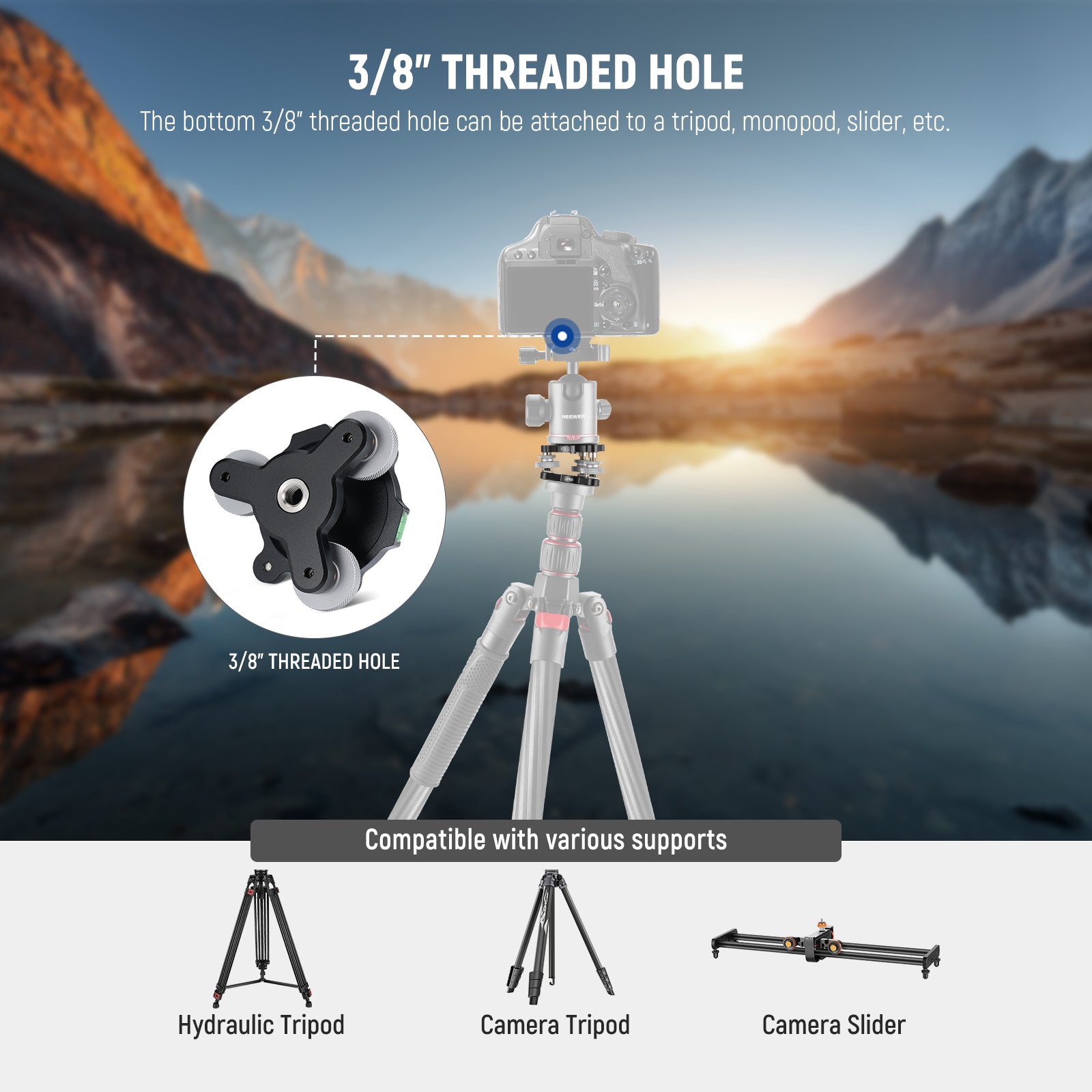 - Tripod Leveling Base with Bubble Level- The tripod leveling base features three short support pillars that provide up to +/-9° leveling adjustments with thumb screws. The built in bubble levels help check the camera level at a glance and always keep it straight. The bottom 3/8" threaded hole can be attached to a tripod, monopod, slider, etc.