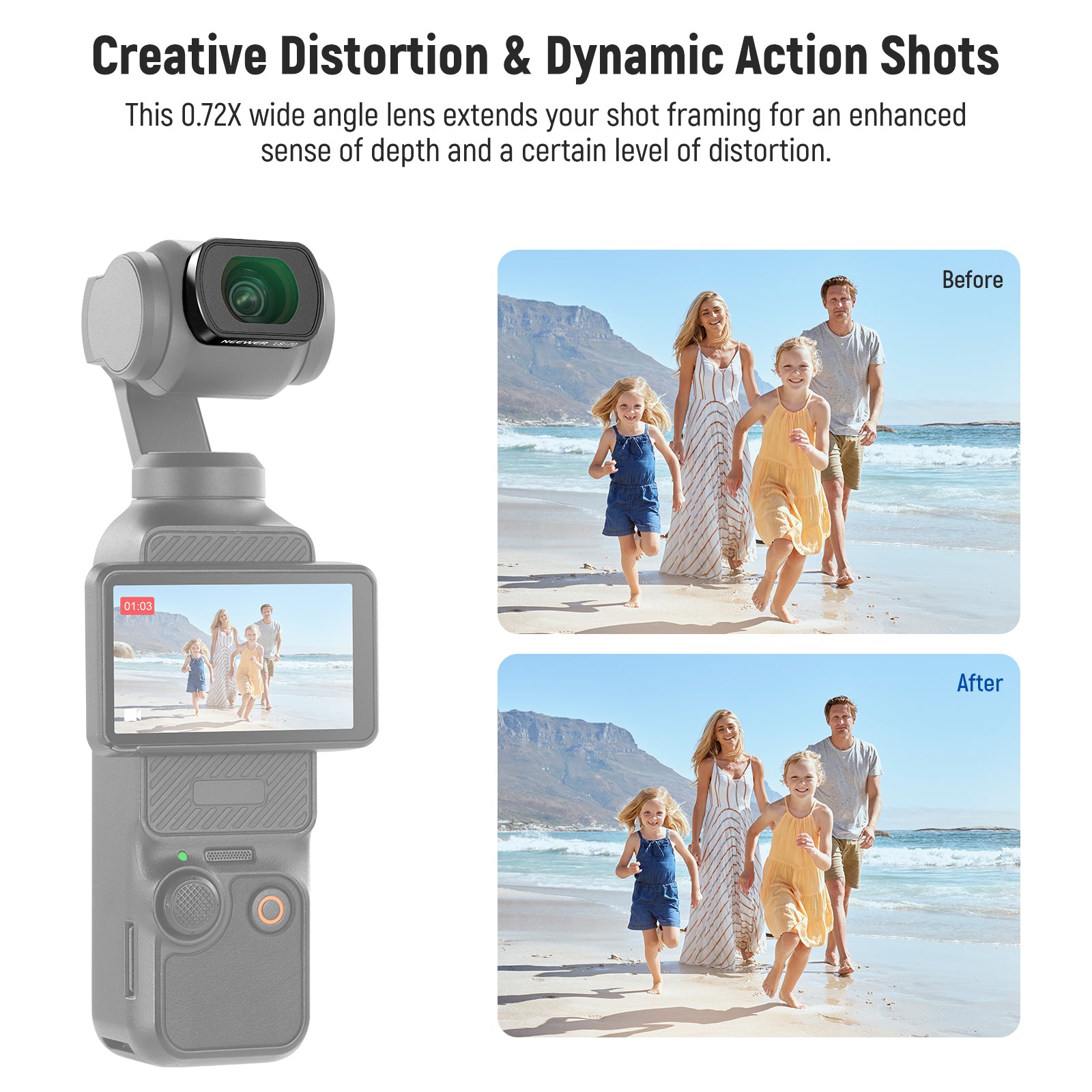- Capture More in the Frame- Expand the field of view (FOV) to 112° and fit more subjects in the frame with slight edge distortion—ideal for immersive and creative street photography, natural and urban and landscape, architecture, and group shots. Essential action camera photography accessories and must have gear for content creators and influencers