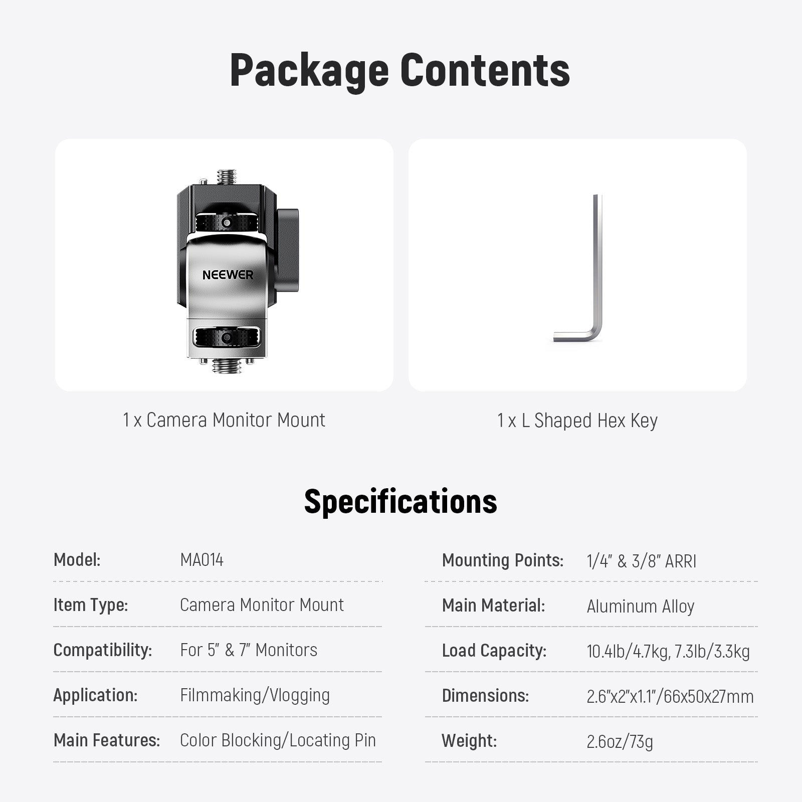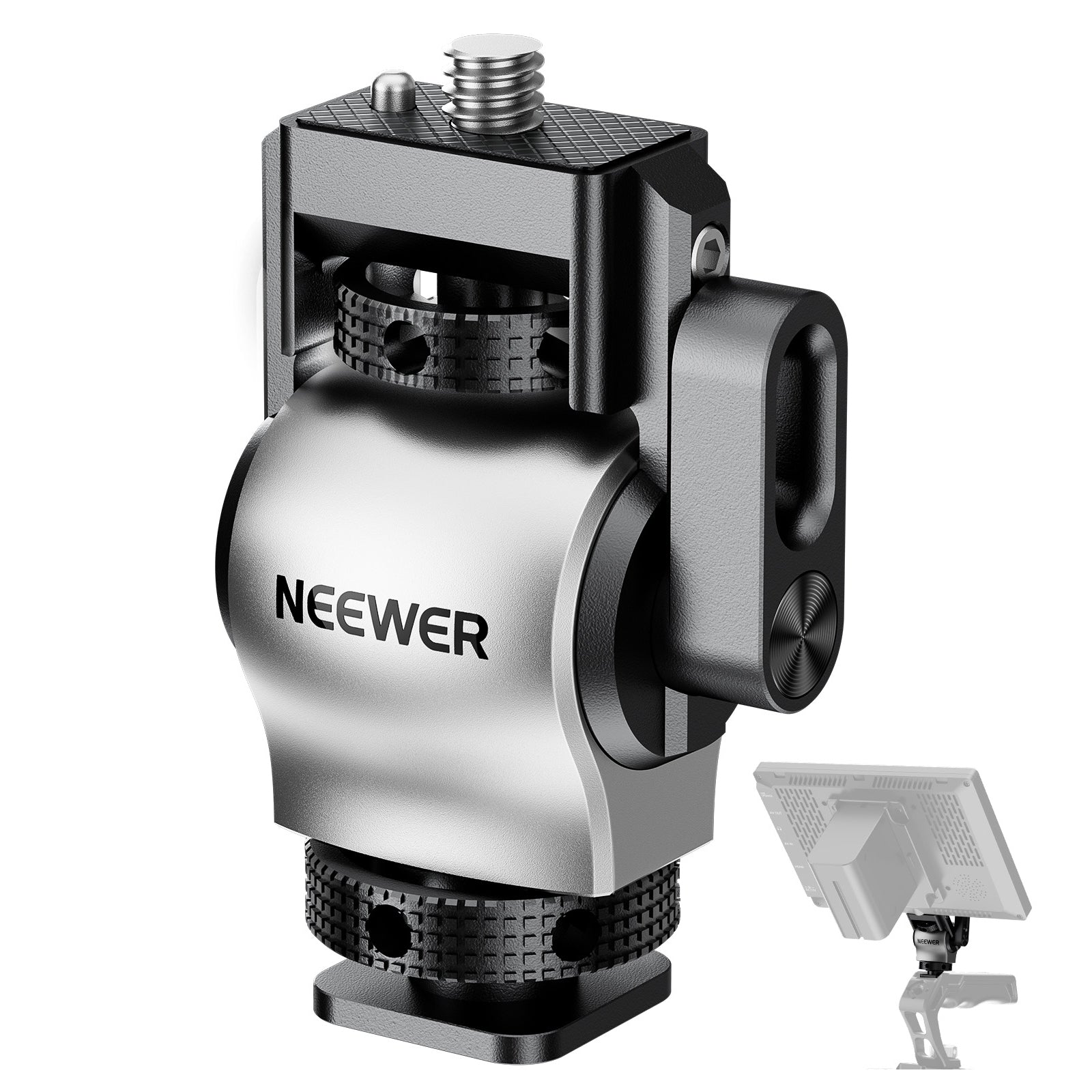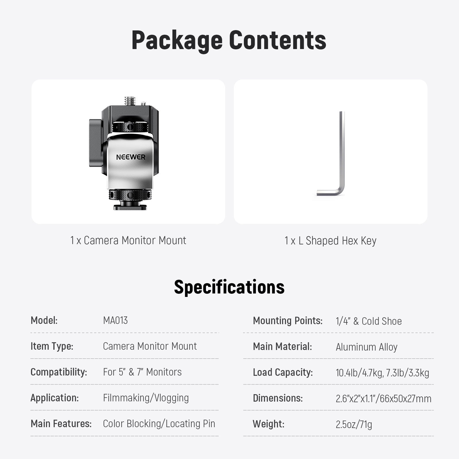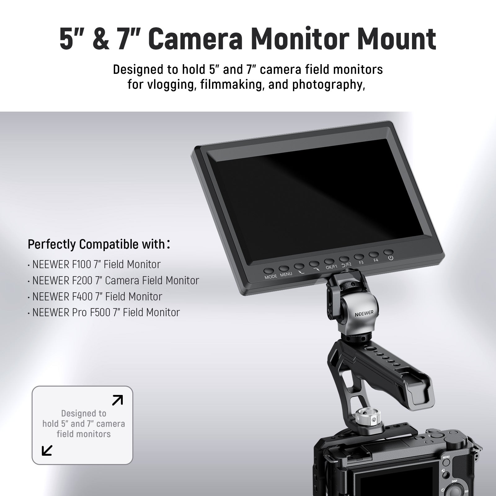 - 5"~7" Camera Monitor Mount- Designed to hold 5"~7" camera field monitors for vlogging, filmmaking, and photography, this field monitor mount with a cold shoe is compatible with SmallRig NEEWER camera cages, video rigs, top handles, side handles, gimbal sling handles and camera hot shoes. The silver and black color blocking aluminum alloy build is durable and stylish