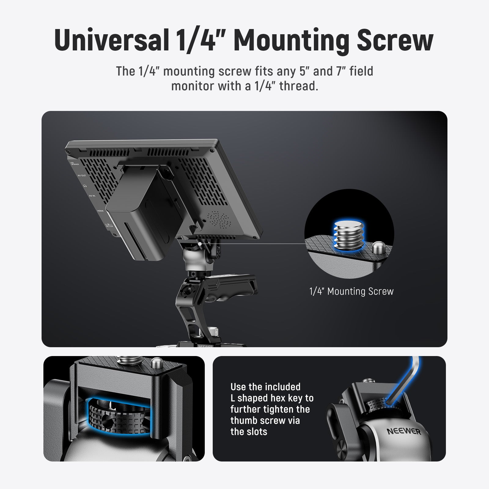 - Universal 1/4" Mounting Screw- The 1/4" mounting screw fits any 5"~7" field monitor with a 1/4" thread. Use the hand tighten thumb screw for convenient mounting and the included L shaped hex key to further tighten the thumb screw via the slots