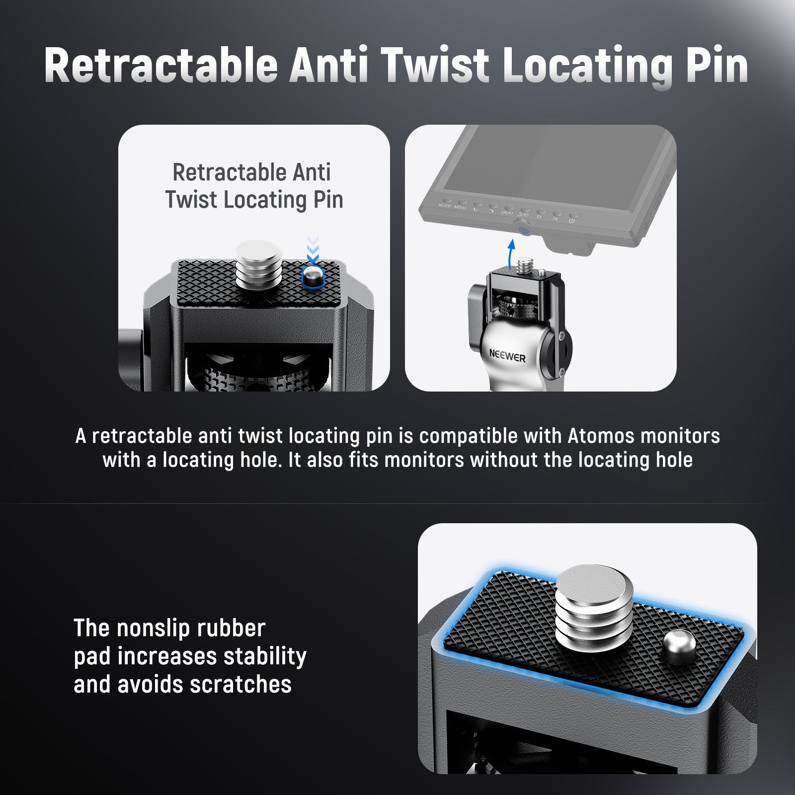 - Retractable Anti Twist Locating Pin- A retractable anti twist locating pin is compatible with Atomos Ninja V Ninja V+ and other monitors with a locating hole. It also fits monitors without the locating hole like NEEWER F100 F200 F400 Pro F500. The nonslip rubber pad increases stability and avoids scratches
