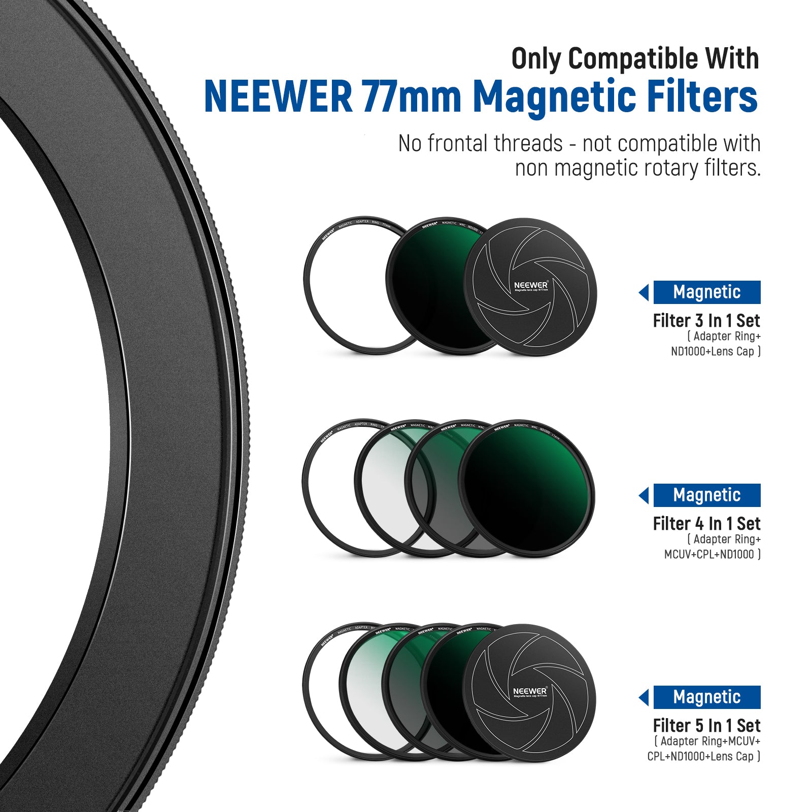 Note: Only compatible with NEEWER 67mm/72mm/77mm magnetic filters. It doesn’t have front threads and is NOT compatible with nonmagnetic screw filters.