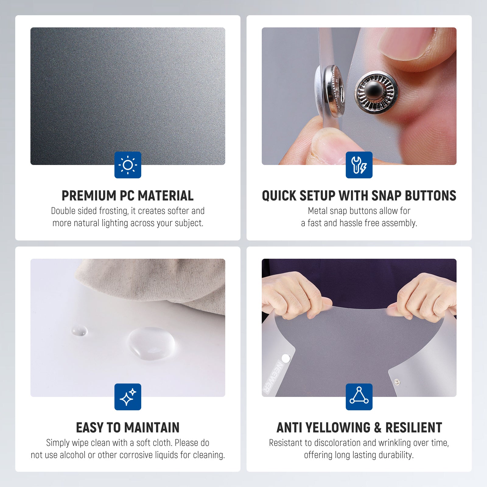 - Photo Box Alternatives- Made from 0.5mm thickened PC material with high transmittance and heat resistance, this NEEWER conical softbox kit replaces traditional photo boxes for clean and professional product photography, photoshoot, video recording and filming. A versatile mini soft box lighting diffuser set, it works with equipment such as LED lights, studio flashes, off camera flashes, speedlights, speedlites, and desk lamps