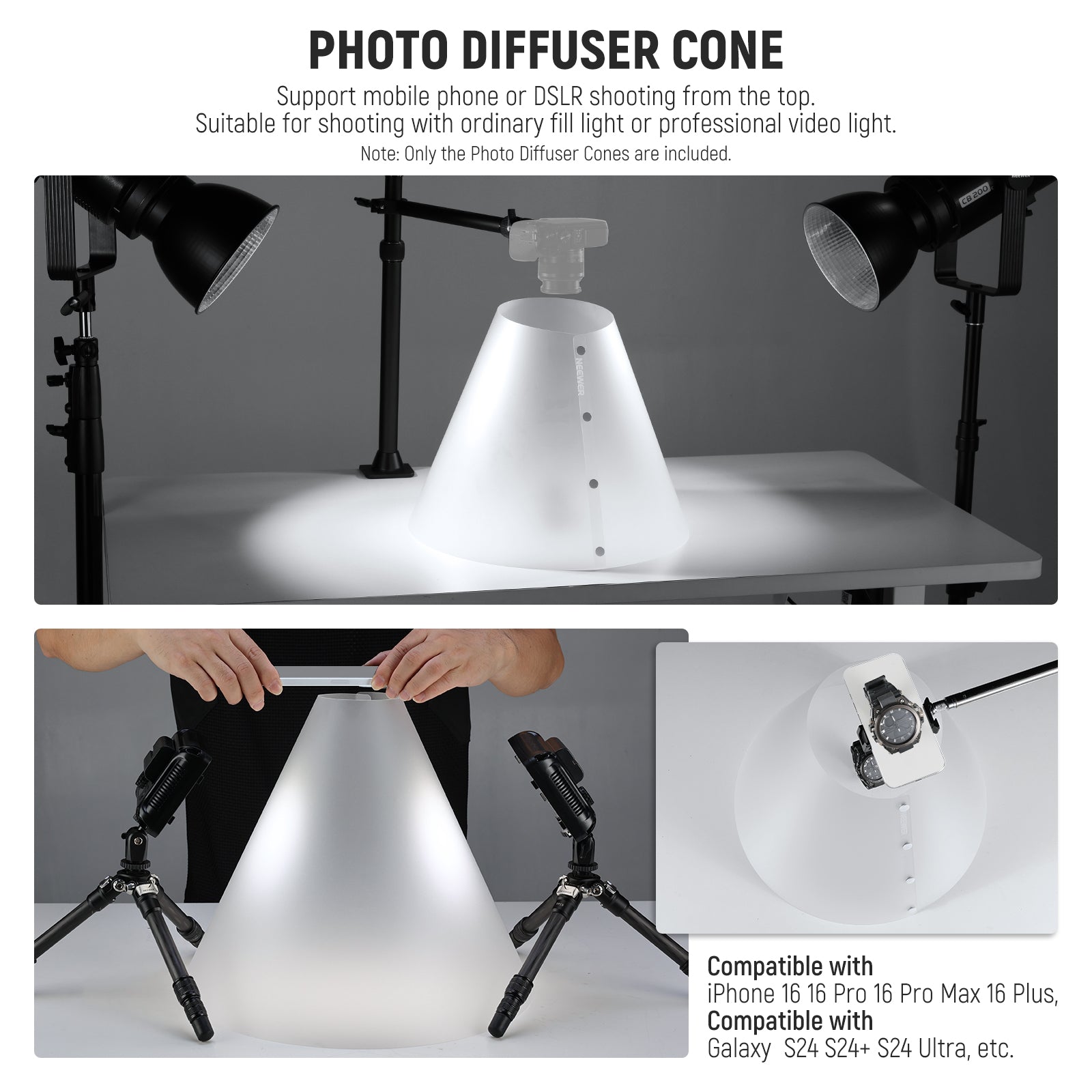- Available in Three Sizes- Available in 14"/356mm, 15"/381mm, and 20"/508mm, this light diffusion cone kit is suitable for a variety of subjects like accessories, watches, cosmetics, household electronics, and other reflective and glossy items. The smallest cone is compatible with iPhone and Android for smartphone shooting. Ideal for content creator essential and influencer must have photography, videography and streaming continuous lighting gear