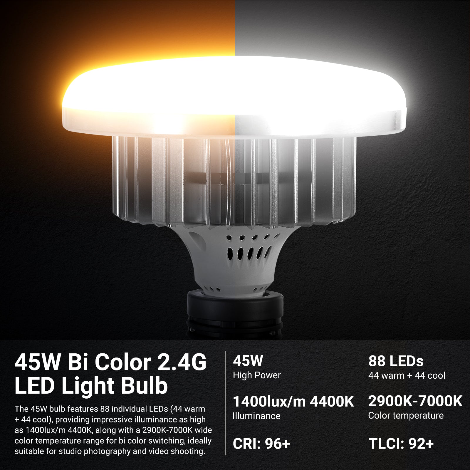- 45W Bi Color 2.4G LED Light Bulb- The 45W bulb features 88 LEDs (44 warm + 44 cool LEDS), providing impressive illuminance as high as 1400lux/m 4400K, along with a 2700K-7000K wide color temperature range for bi color switching, ideally suitable for studio photography and video shooting. Use the included 2.4G remote to control the 2 bulbs independently within 66'/20m, each of which can be set to 10 channels. The remote can be set to Channel 88 to control all the channels