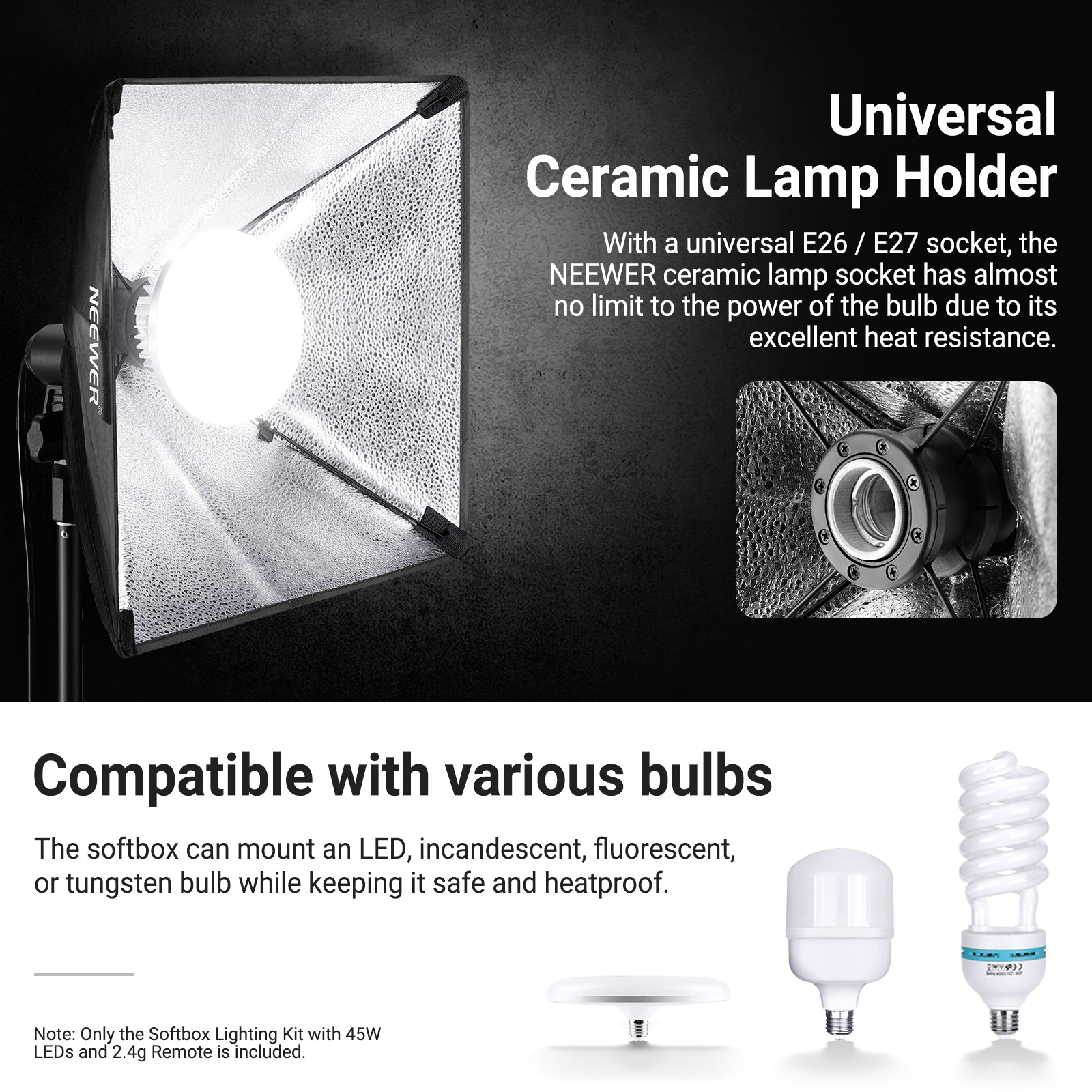 - 24"X24"/60x60cm Softbox- This softbox with silver lining effectively reflects and diffuses light output from the bulb, providing even and flattering illumination for your best shots. Featuring an E26 socket, it allows direct connection to LED light bulbs, fluorescent bulbs, or slave flashes, offering versatile lighting solutions