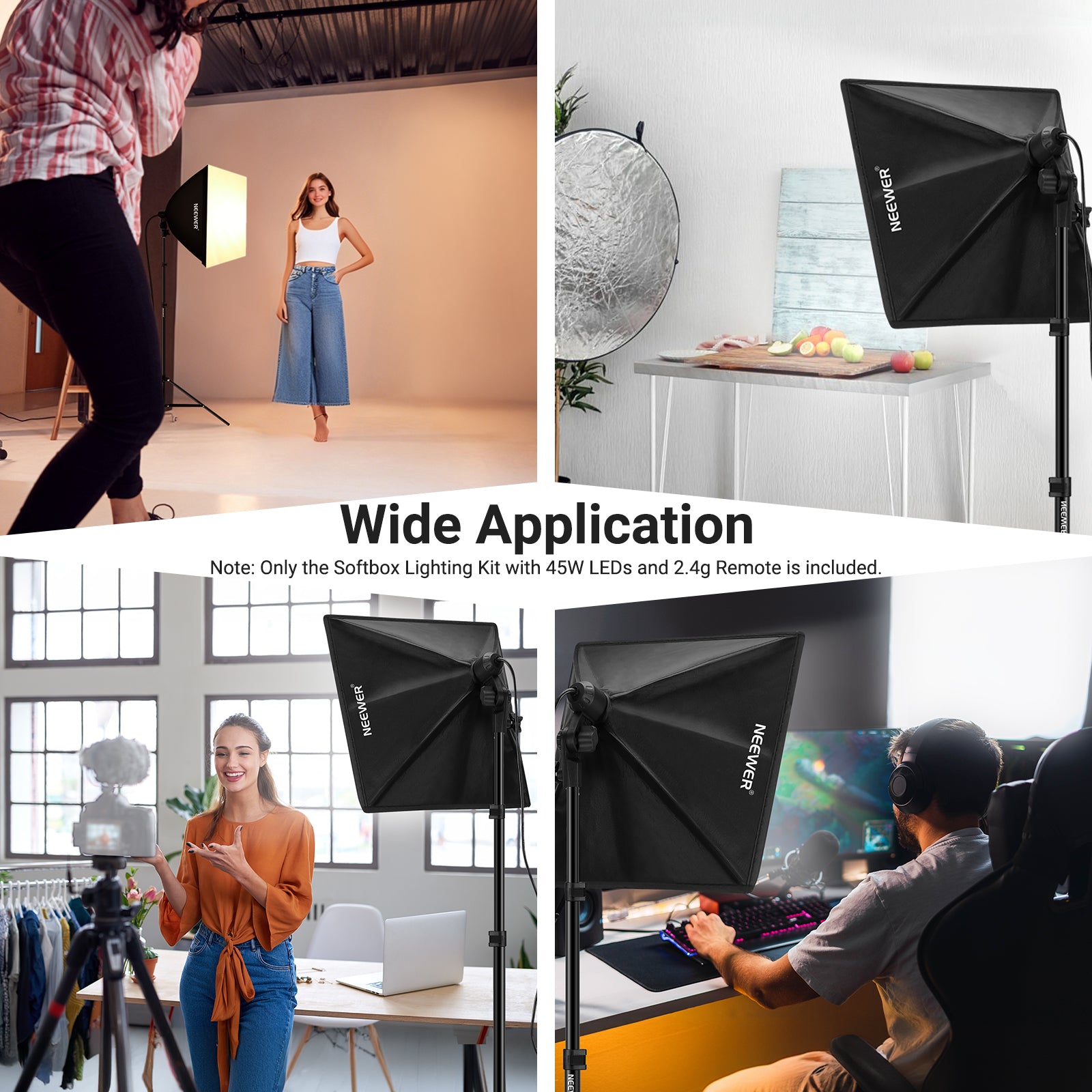 - Comprehensive Studio Lighting Kit- Includes 2 24"x24" square softboxes, 2 bi color LED bulbs, 2 adjustable light stands, a 2.4G remote control, and a carrying bag, bringing you a professional lighting setup for live streaming, portrait & product photography, photo art, and many other creative endeavors