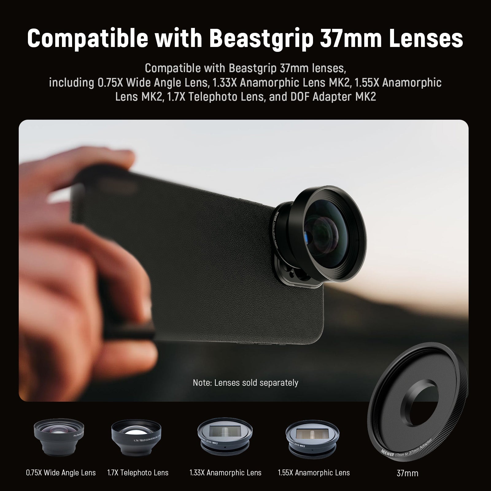 - Compatible with Beastgrip 37mm Lenses- Compatible with Beastgrip 37mm lenses, including 0.75X Wide Angle Lens, 1.33X Anamorphic Lens MK2, 1.55X Anamorphic Lens MK2, 1.7X Telephoto Lens, and DOF Adapter MK2