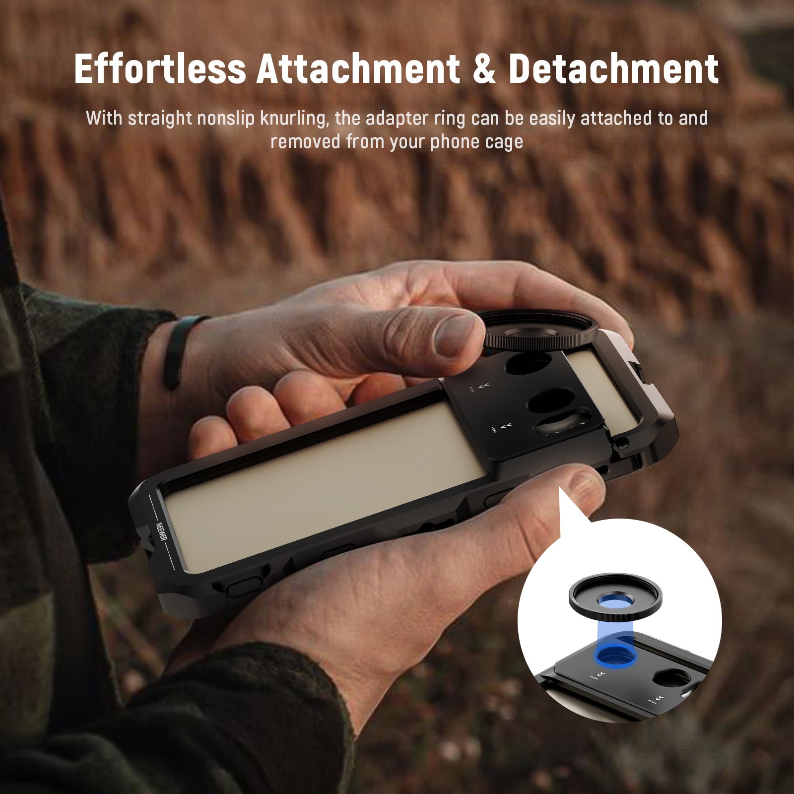 - Effortless Attachment & Detachment- With straight nonslip knurling, the adapter ring can be easily attached to and removed from your phone cage