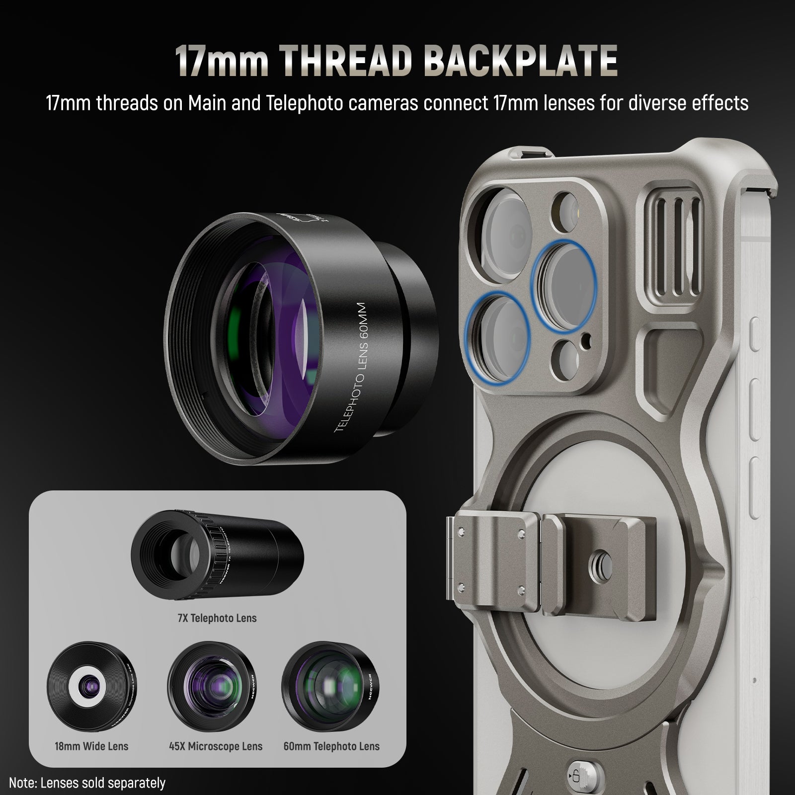 - Integrated 17mm Thread Backplate- The built in lens backplate features 17mm threads for Main Camera and Telephoto Camera, enabling you to mount 17mm phone lenses for creative photography and videography