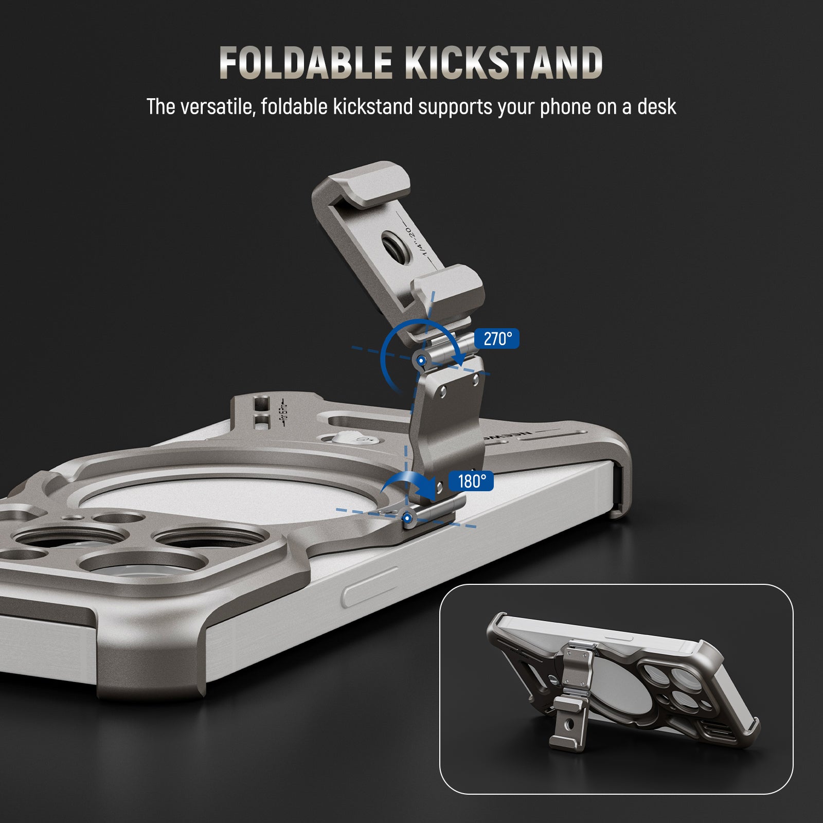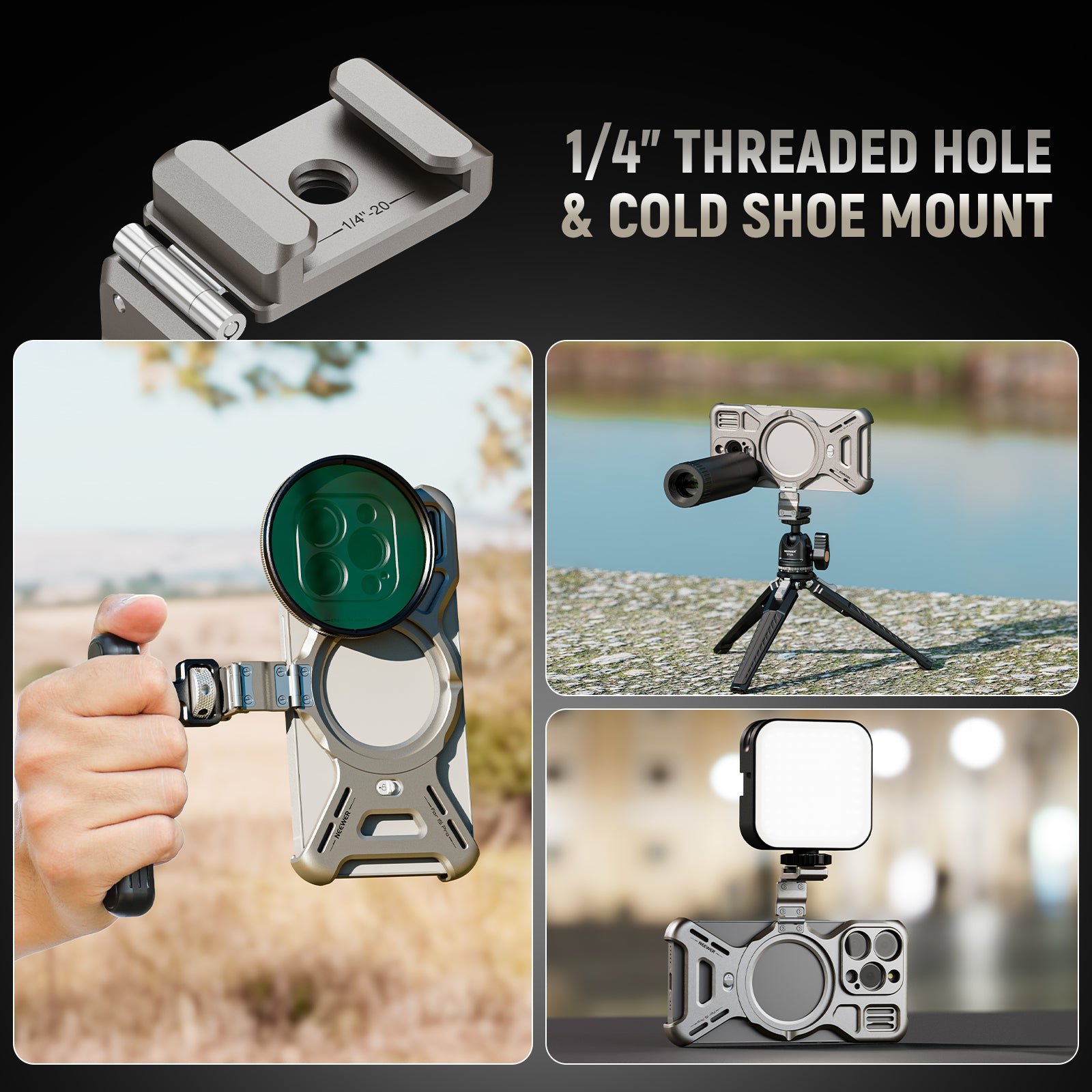 - Foldable Kickstand with Cold Shoe- The versatile, foldable kickstand supports your phone on a desk in both vertical and horizontal positions. It features a cold shoe to connect accessories like the RGB62 LED Light, CM14 PRO Microphone, UA059 SSD Holder, plus a 1/4" thread for the PA046 Side Handle and TP29 Mini Desktop Tripod