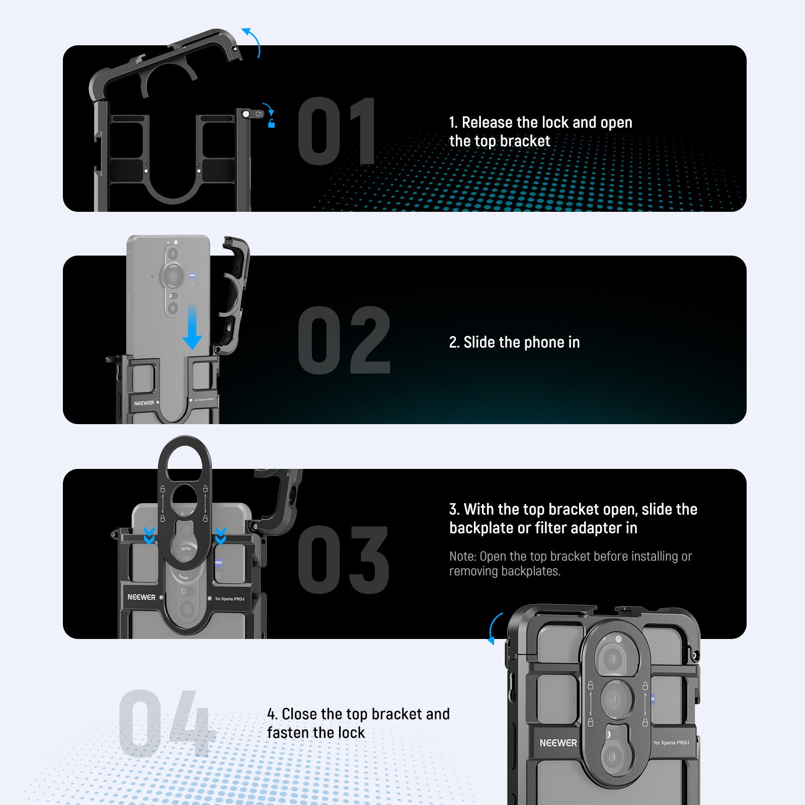 - 1 Click Installation with Full Access- This integrated phone stabilizer cage quickly opens and locks via a side button and offers full access to the camera, buttons, and charging port. Slide in the filter adapter and lens backplates first, then secure them with the top bracket for stable support for handheld phone recording, even with heavy filters and lenses