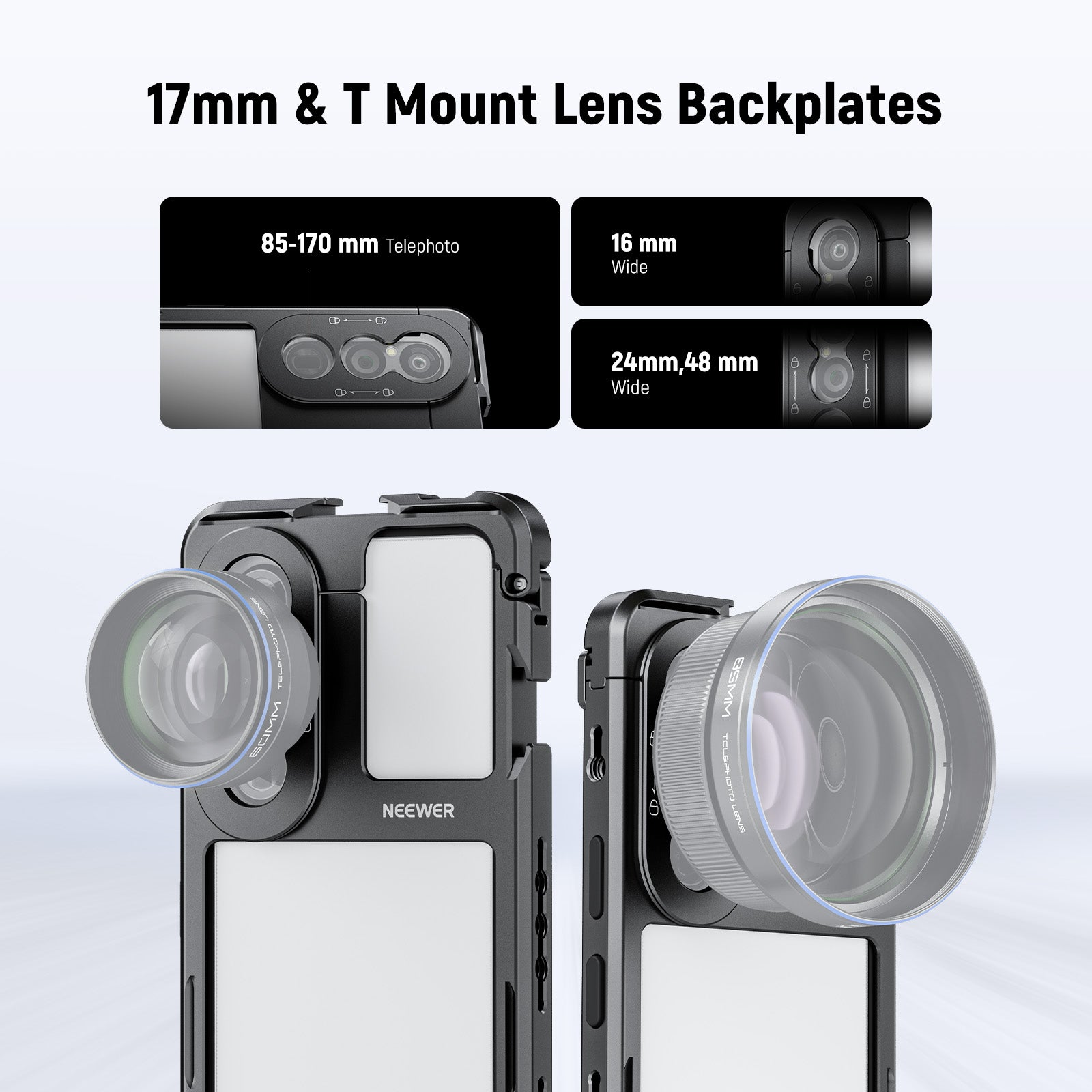 - 17mm & T Mount Lens Backplates- The 17mm threaded lens backplate mounts 105mm macro, 10x macro, 8mm fisheye, 45x microscope, 7x telephoto, 60mm telephoto, 18mm wide angle, 1.55x blue anamorphic, and other 17mm NEEWER phone lenses. The T mount lens backplate is compatible with Moment T Series mobile lenses, including anamorphic, macro 10x, tele 58mm, wide 18mm, and fisheye 14mm (lenses sold separately, lens mount on main camera only)