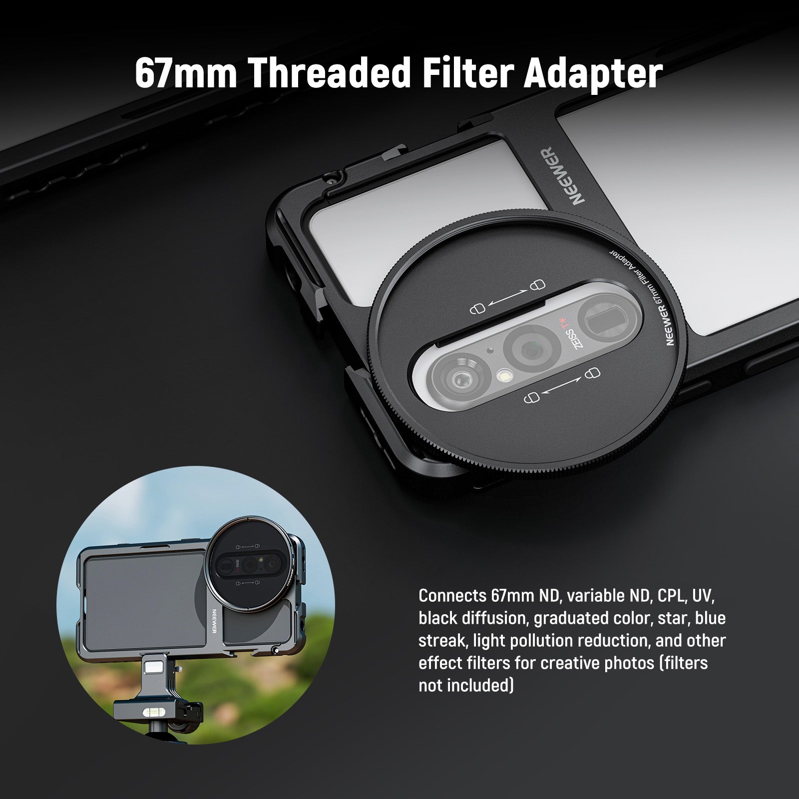 - 67mm Threaded Filter Adapter- The 67mm filter adapter connects ND, variable ND, CPL, UV, black diffusion, graduated color, star, blue streak, light pollution reduction, and other effect filters for creative photos and videos without unwanted vignetting (filters sold separately)