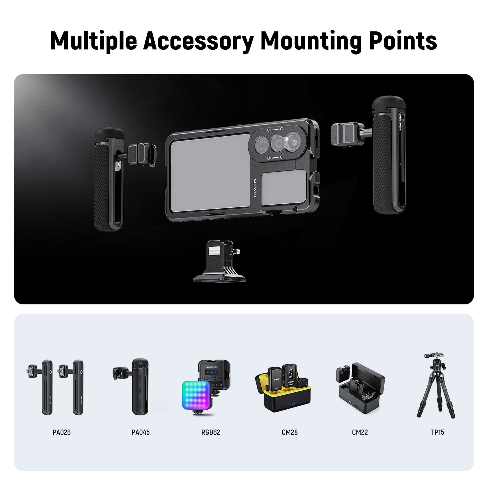 - Multiple Accessory Mounting Points- With 1/4" threads and cold shoe mounts, this cage can connect to PA045 Quick Release Side Handle, PA026 Dual Side Handles, PA005E Side Handle with Bluetooth Wireless Shutter Button, PL81 Mini LED Video Light, RGB61/RGB62 RGB Light, CM22/CM28 Wireless Lavalier Microphone System, CM14 Pro Mini Vlog Microphone, CA070 Weight Reducing Shoulder Strap, T30 Flexible Tripod, T29/T31 Mini Tabletop Tripod, TP15 Carbon Fiber Travel Tripod, and more