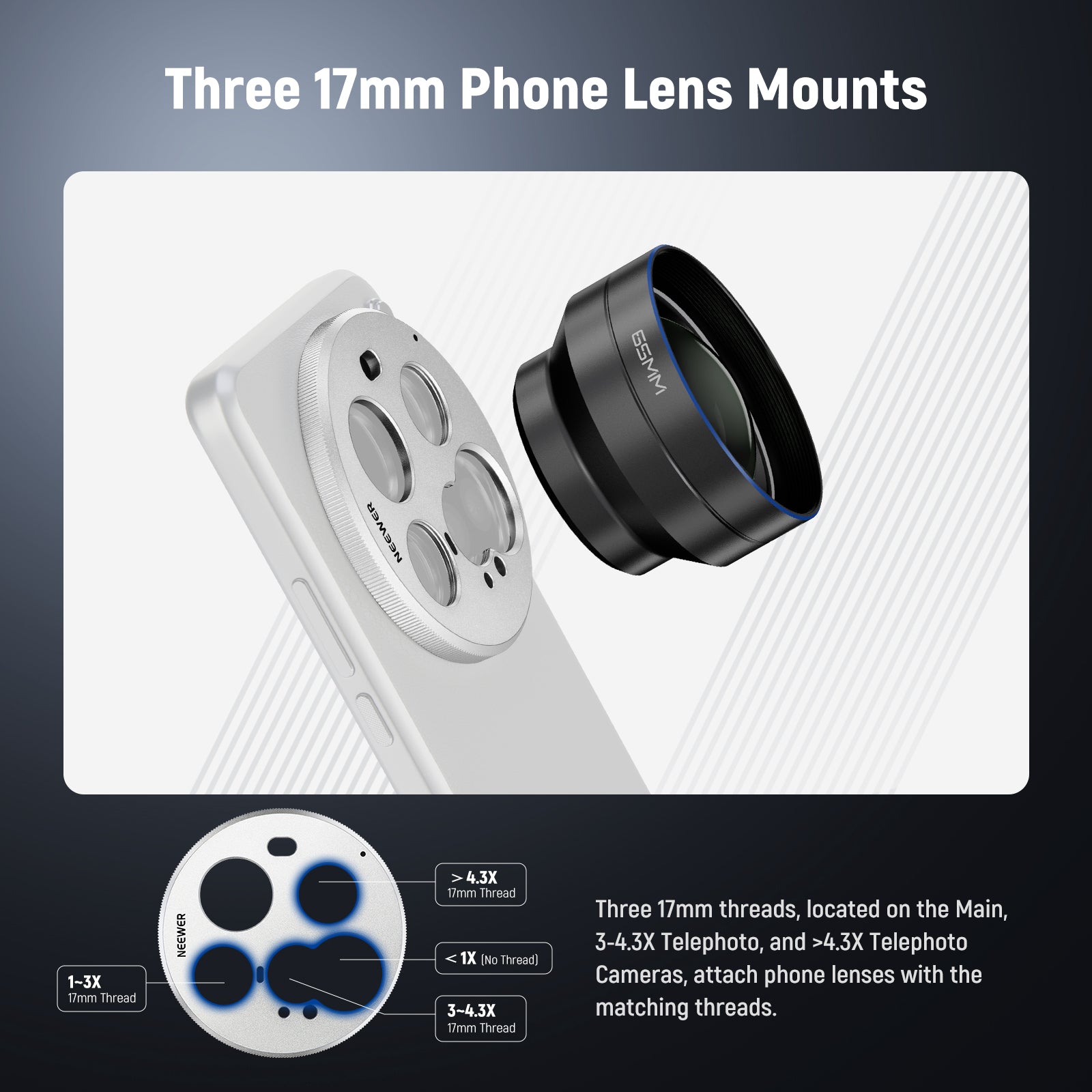• Perfect for NEEWER Phone Lenses- Choose from our diverse phone lens series for your everyday content creation, including 105mm macro, 10x macro, 8mm fisheye, 45x microscope with LED light, 7x telephoto, 60mm telephoto, 18mm wide angle, 1.55x blue anamorphic, and other NEEWER phone attachment lenses with 17mm threads (all sold separately)