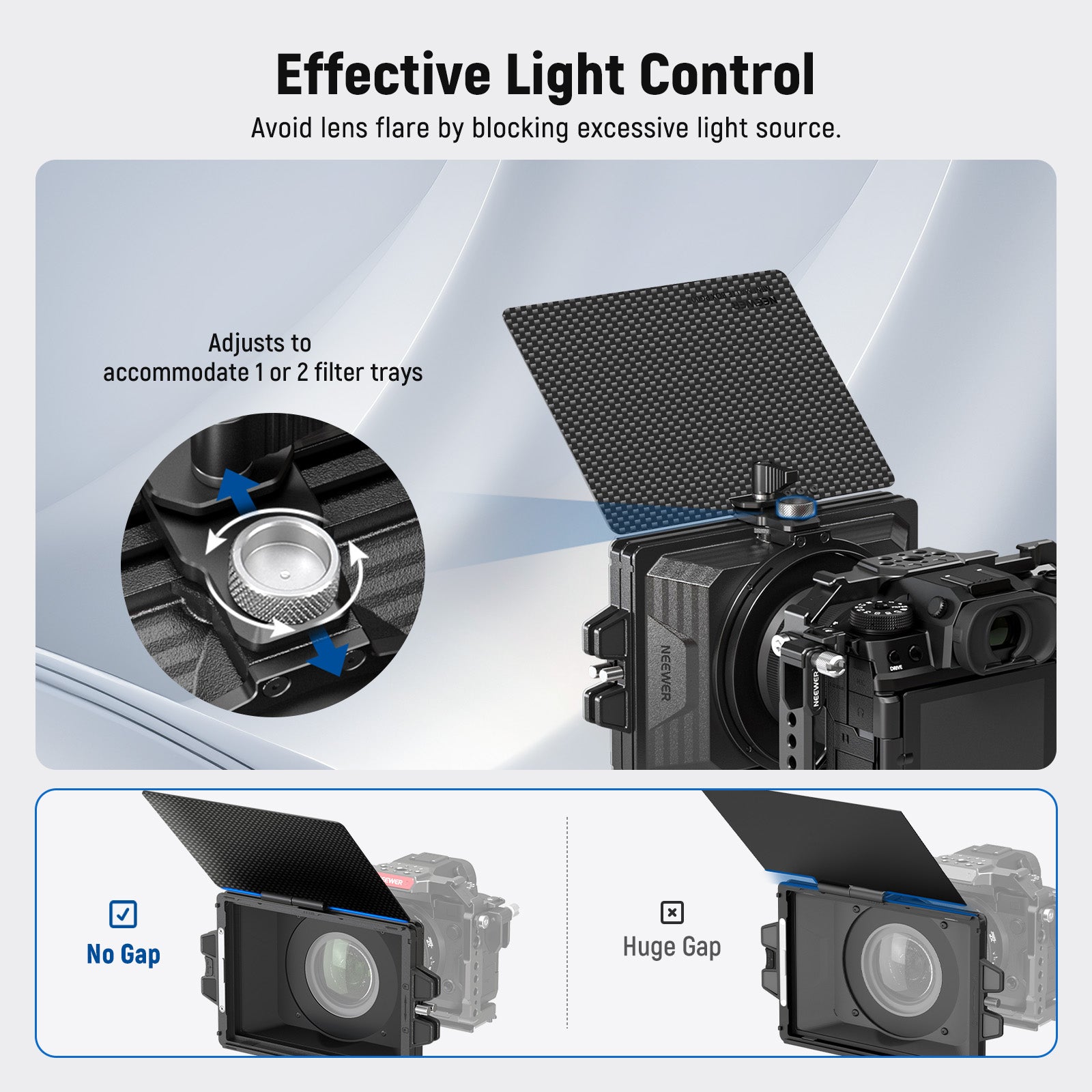 - 180° Tilt Flag with "Plain" Carbon Fiber Weave- Tilt the top flag 180° to block excessive light and prevent lens flare. Fold down the flag to cover the front filter and protect the lens. The top flag lock firmly secures the flag in place. And the thumb screw allows you to adjust the flag back and forth to accommodate 1 or 2 filter trays for perfect light blockage