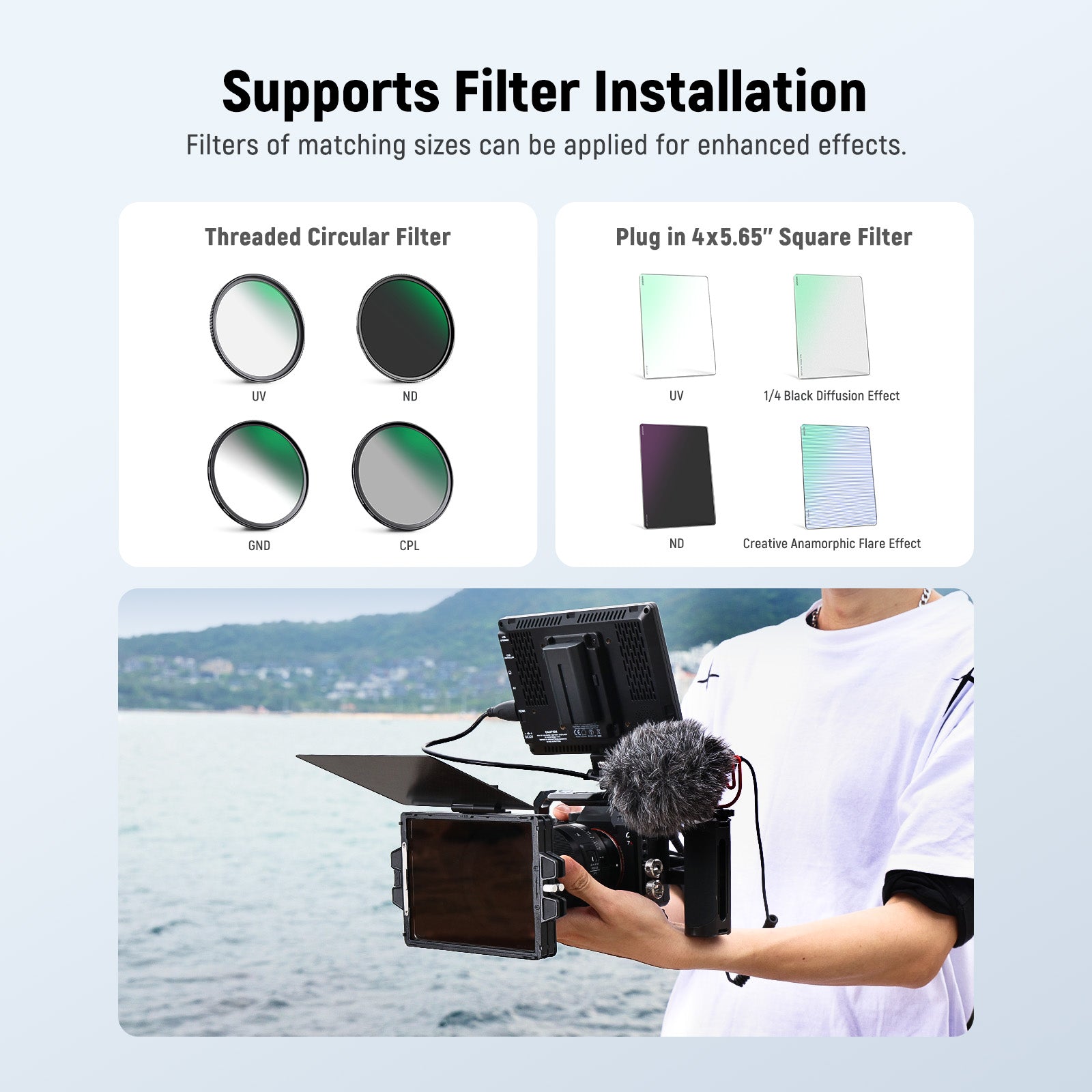 - 2 Stackable Filter Trays- 2 filter trays can hold NEEWER ND0.3/0.6/0.9/1.2/1.5/2.1 Cinema Neutral Density Filter UV Filter Black Diffusion 1/4 Filter, etc, also compatible with K&F compatible with NISI compatible with TIFFEN 4"x5.65" square rectangular filters (not included). Stack the filter trays by sliding them into the bottom slots. Push the quick release buttons to remove them. Filters can be secured by the filter tray screw knobs and protected by rubber pads