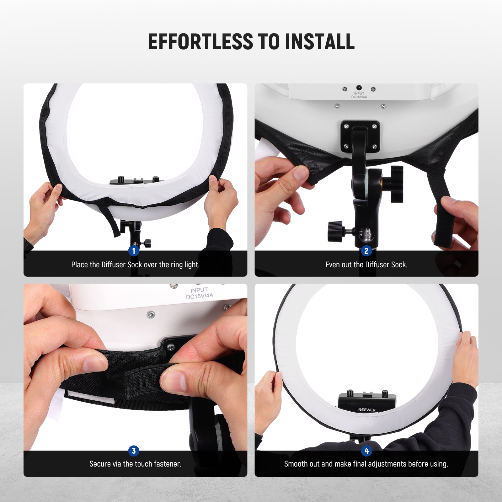 - Effortless to Install- The diffuser’s elastic bands can easily cover the RP18B Pro Ring Light. The hook and loop fastener helps to secure this formfitting diffuser and prevent light leakage