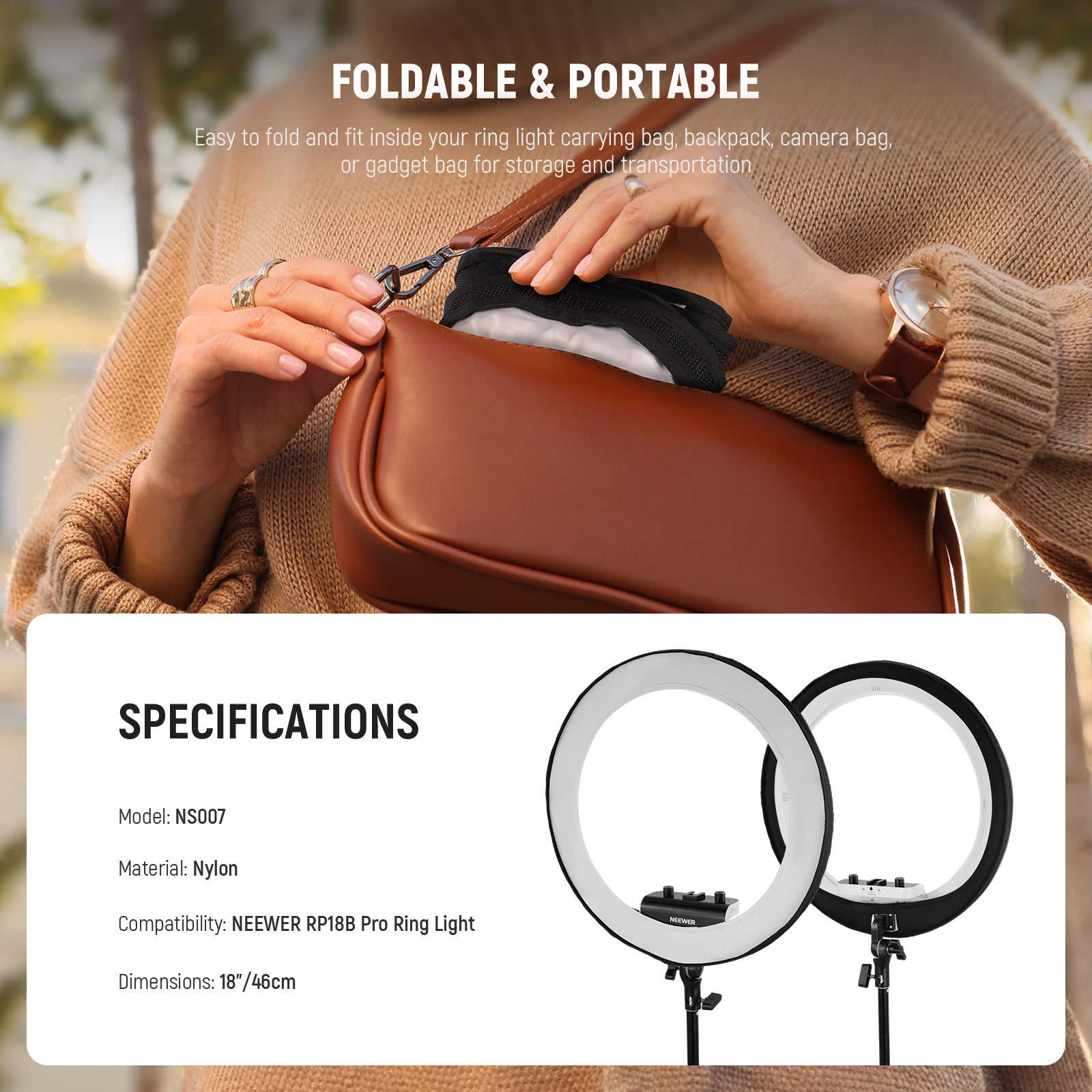 - Foldable & Portable- Easy to fold and fit inside your ring light carrying bag, backpack, camera bag, or gadget bag for storage and transportation